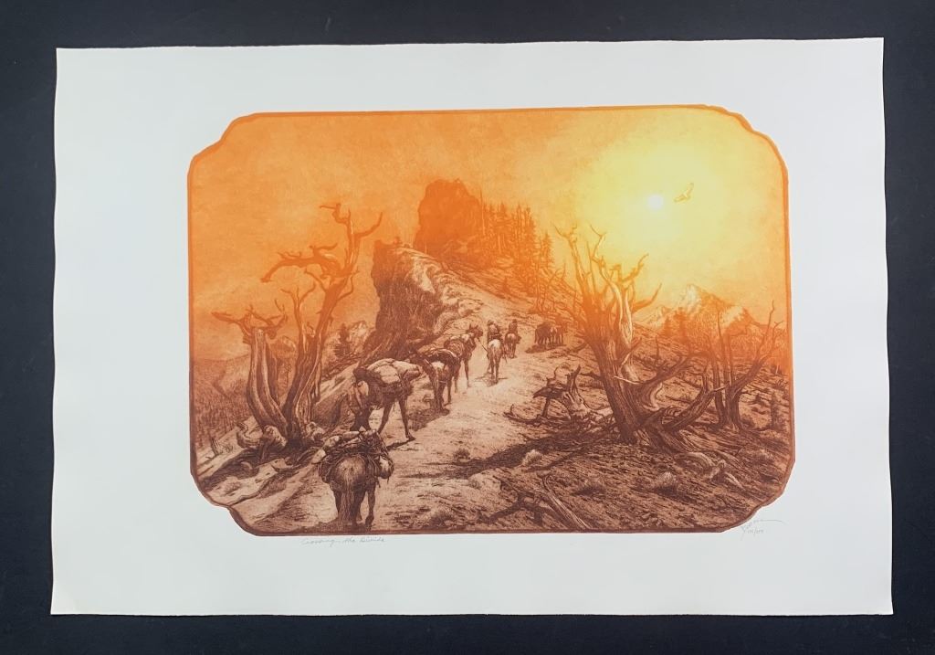 Roy Purcell's "Crossing the Divide" limited edition print, signed and numbered 135/250 lower right, and titled lower left. This piece is of men on horseback going up a trail, attempting to 'cross the divide', with the sun setting off in the distance. This piece is in near excellent condition with an extremely minor crease lower left corner.