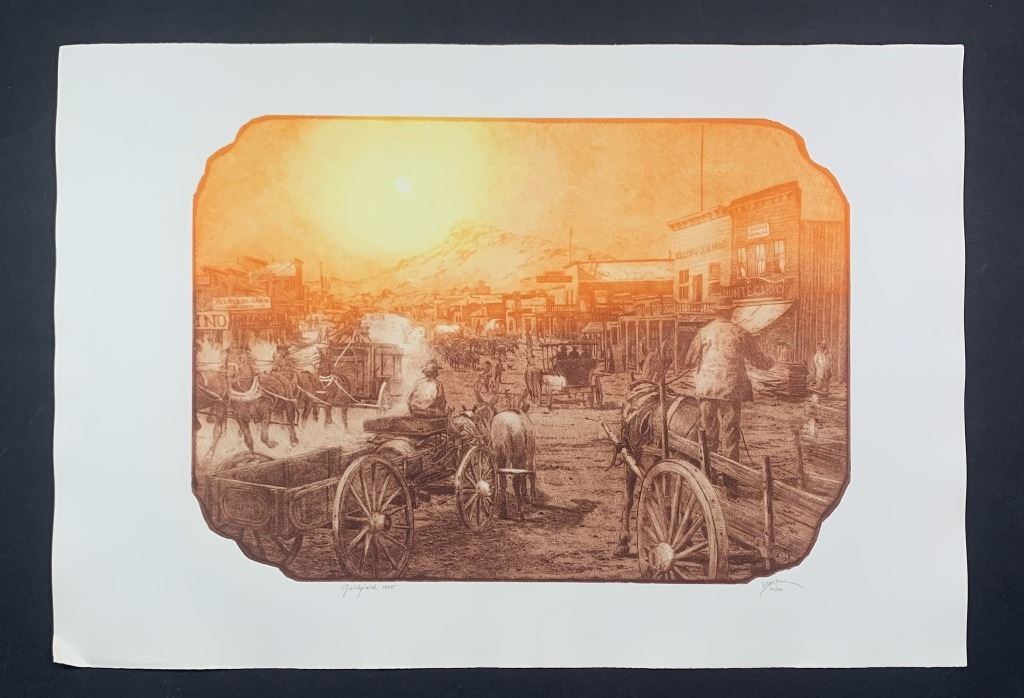 Roy Purcell's "Goldfield 1905" limited edition print, signed and numbered 82/250 lower right, and titled lower left. This piece is of a busy western street in 1905, with many horse drawn carriages and wagons, with the sun starting to set off in the distance. This piece is in near excellent condition with a very minor crease lower left corner.