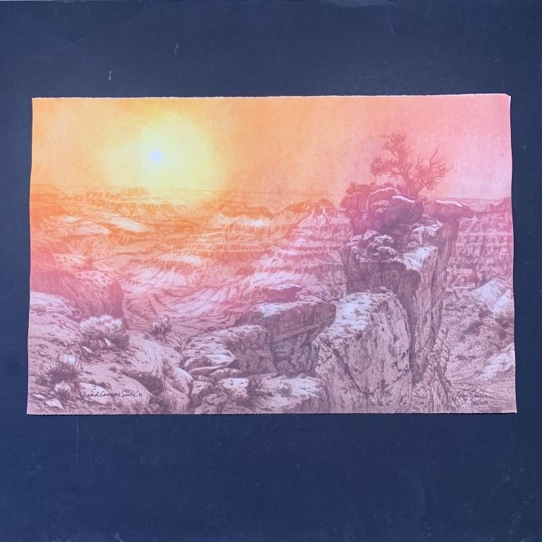 Roy Purcell's "Grand Canyon Suite III" limited edition print, signed and numbered 132/250 lower right. This piece is of a setting sun in a tundrous desert. This piece is in excellent condition
