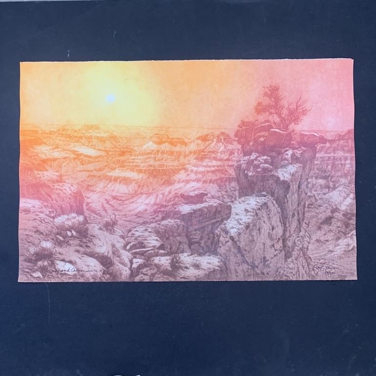 Roy Purcell's "Grand Canyon Suite III" limited edition print, signed and numbered 133/250 lower right. This piece is of a setting sun in a tundrous desert. This piece is in excellent condition