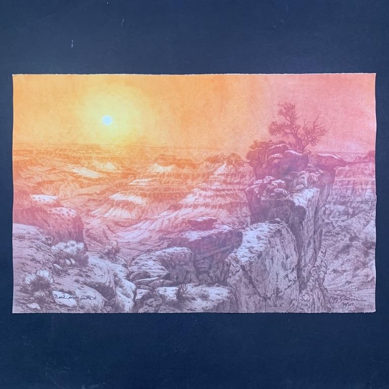 Roy Purcell's "Grand Canyon Suite III" limited edition print, signed and numbered 130/250 lower right, and titled lower left. This piece is of the Grand Canyon with the sun setting in the background. This piece is in excellent condition.