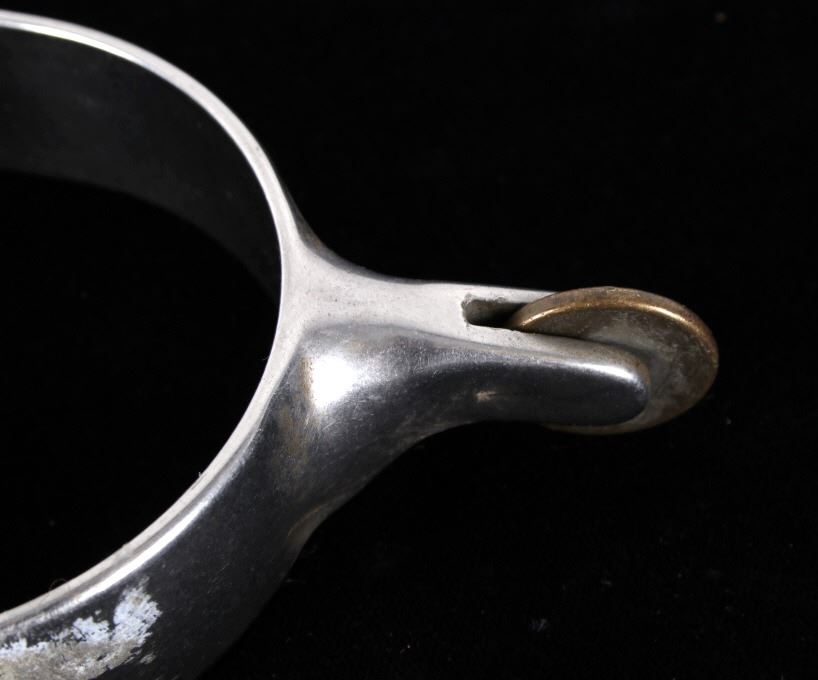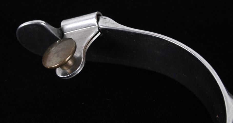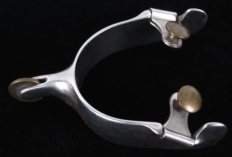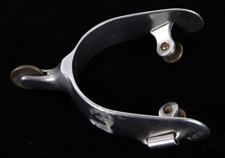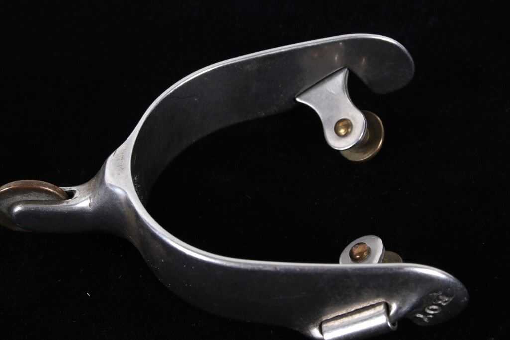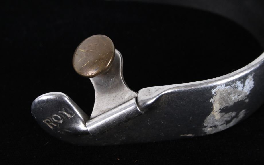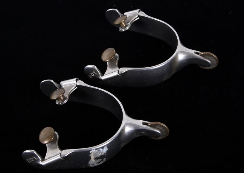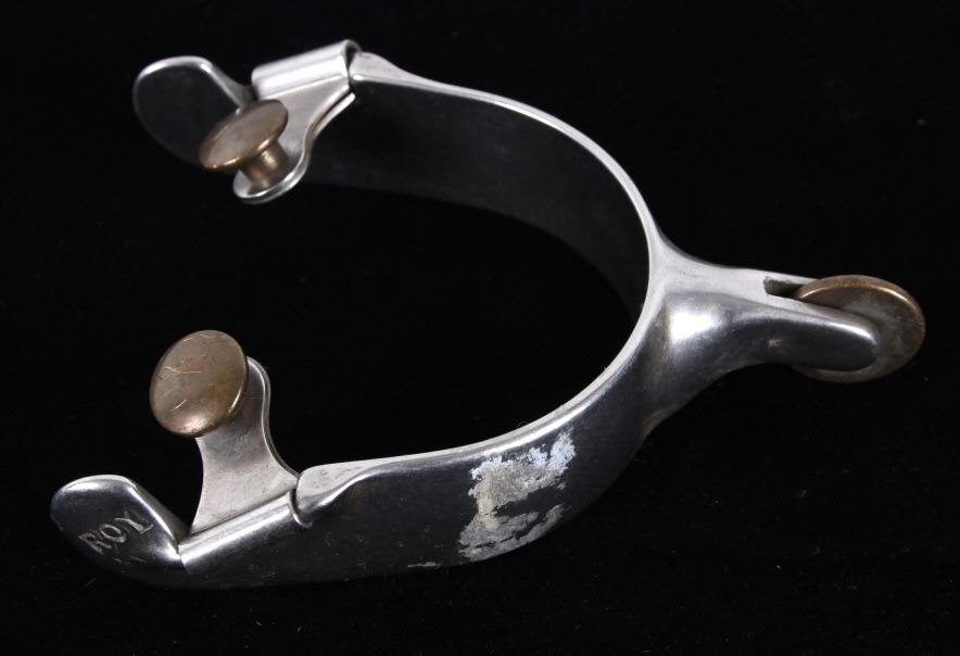 Featured in this lot is this Roy Robinson stainless steel discoidal rowel spurs circa 1970's. The spurs show a wonderfully and professionally crafted stainless stell construction that feature a swivel brass spur strap button and a single piece design to the spurs with a unique discoidal spur rowel. The spurs are marked 'ROY' for Roy Robinson on the tip of teh spur frame. Roy Robinson was a manufacturer of bits, spurs, and saddle hardware. The name of the company was originally Roy Bits & Spurs than later became The Roy Company. He was very respected in the rodeo industry until the company was closed, he later died in 2014. The condition of this pair of spurs is good with no obvious signs of damage and in good overall condition. The measurements of this pair of spurs are 1 3/4" x 4 3/4" x 3 7/8".