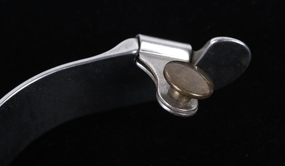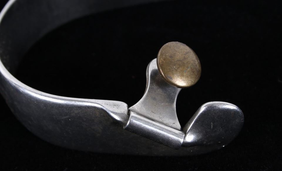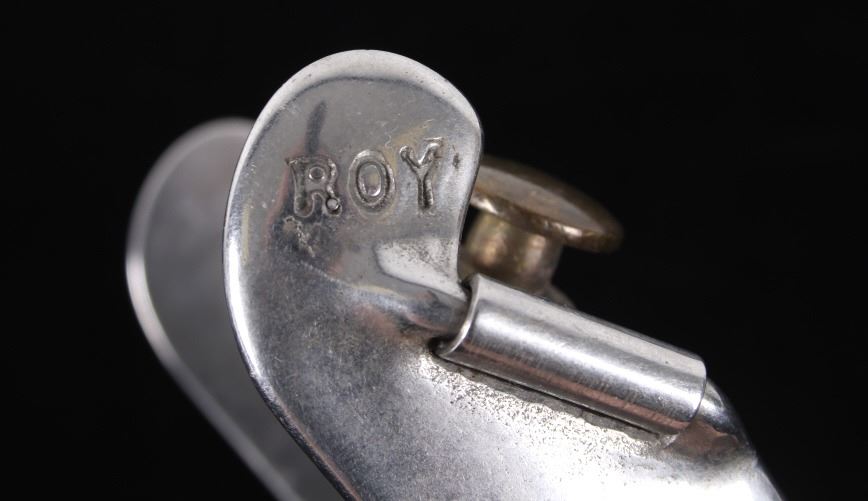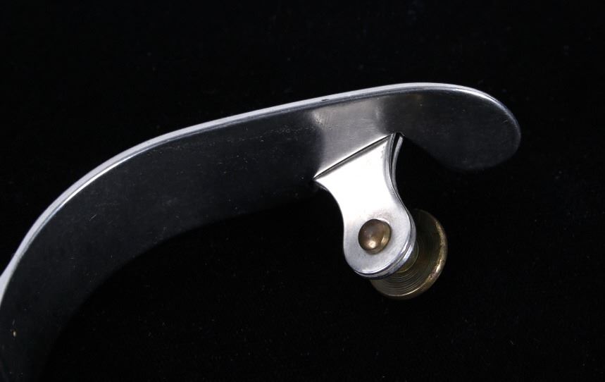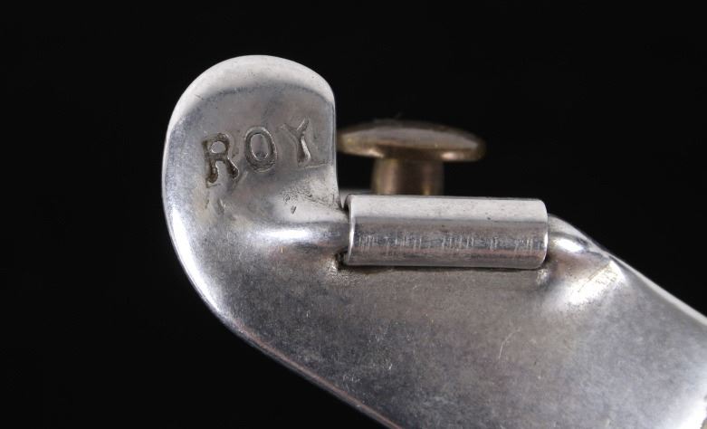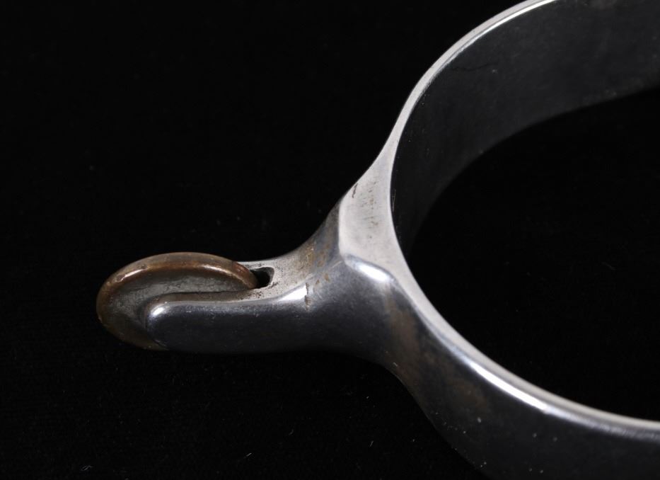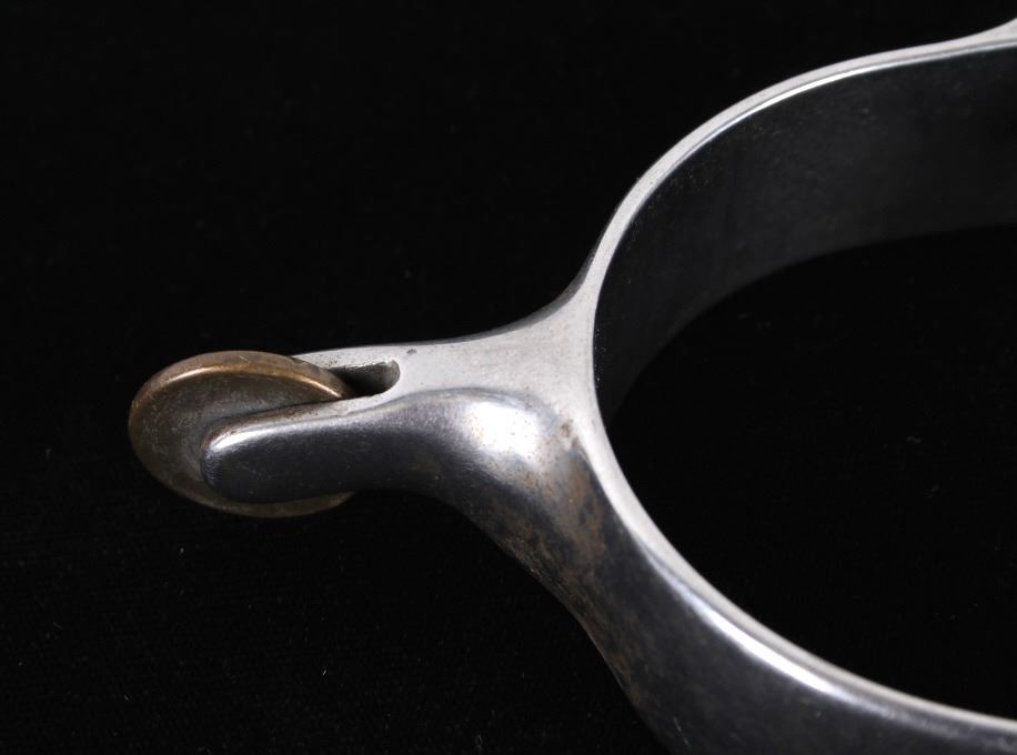 Featured in this lot is this Roy Robinson stainless steel discoidal rowel spurs circa 1970's. The spurs show a wonderfully and professionally crafted stainless stell construction that feature a swivel brass spur strap button and a single piece design to the spurs with a unique discoidal spur rowel. The spurs are marked 'ROY' for Roy Robinson on the tip of teh spur frame. Roy Robinson was a manufacturer of bits, spurs, and saddle hardware. The name of the company was originally Roy Bits & Spurs than later became The Roy Company. He was very respected in the rodeo industry until the company was closed, he later died in 2014. The condition of this pair of spurs is good with no obvious signs of damage and in good overall condition. The measurements of this pair of spurs are 1 3/4" x 4 3/4" x 3 7/8".