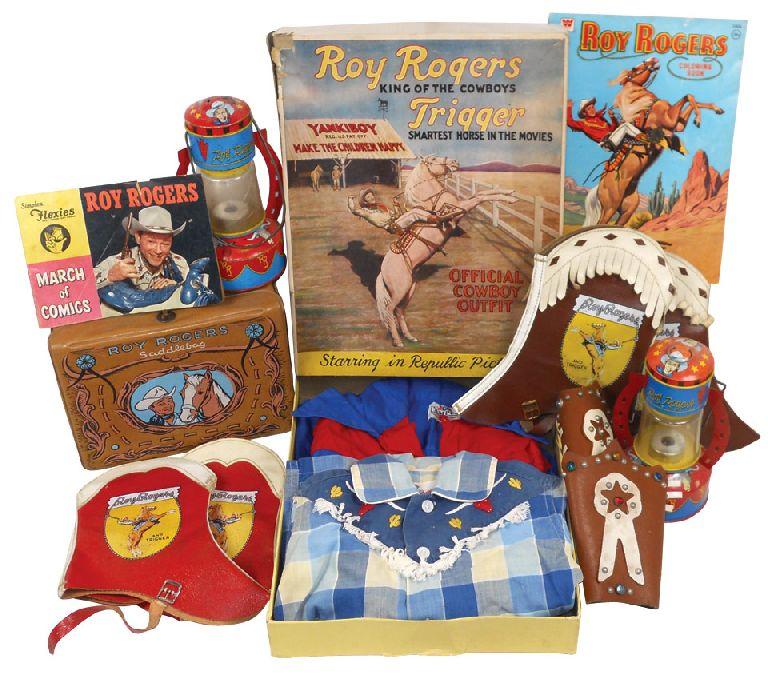 Roy Roger items (9), includes archery set in box, mfgd by Ben Pearson, Inc., vinyl lunch box by Am. Thermos Co., c.1960, stress cracks on bottom, 2 tin lanterns by Ohio Art, RR coloring book, March of Comics book, RR & Trigger boot covers & cuffs & RR Official cowboy shirts (2) in box, all Good to VG cond.