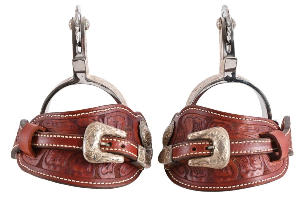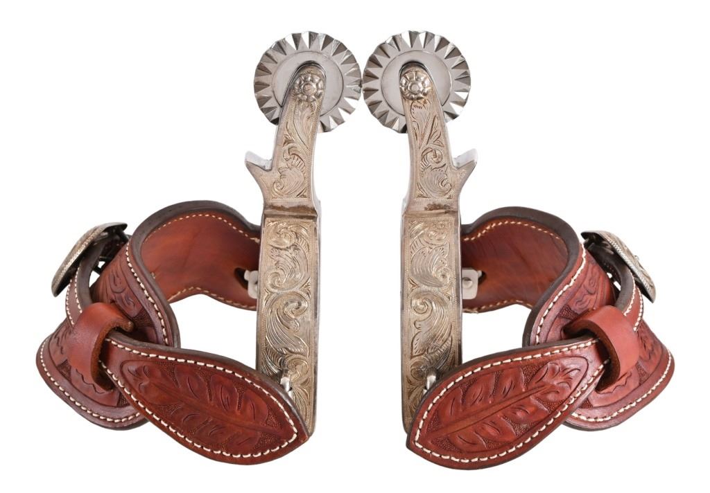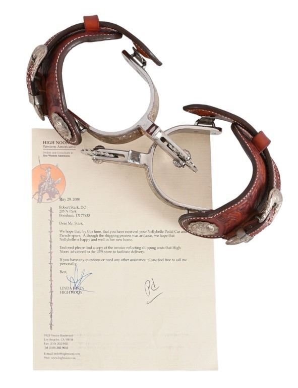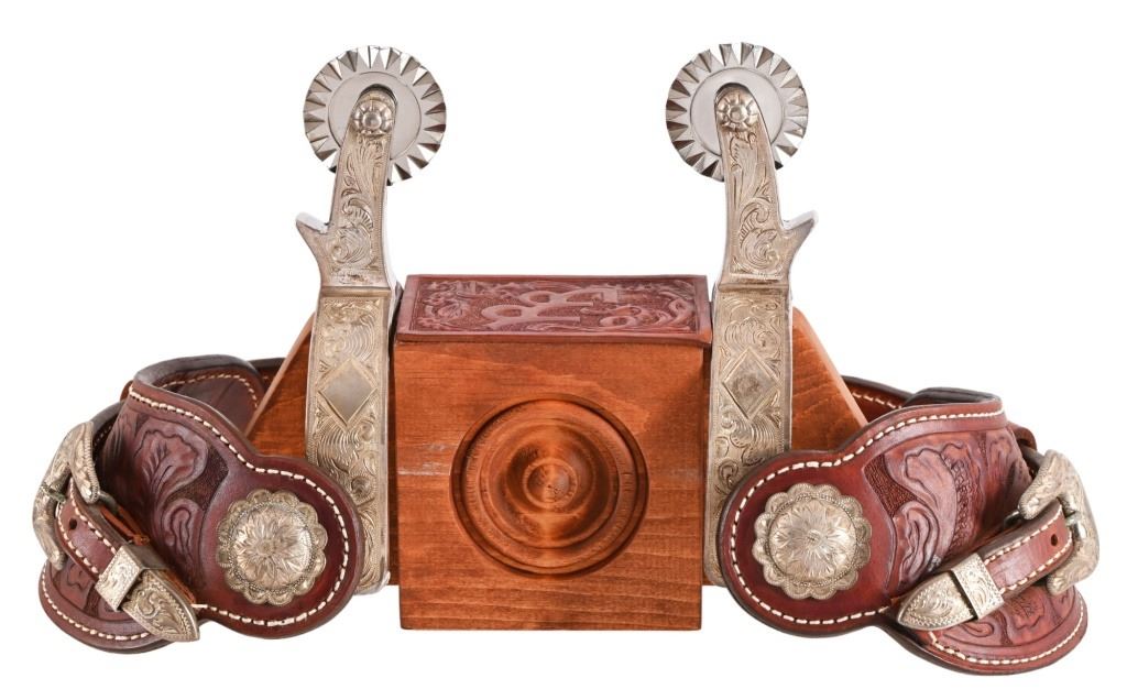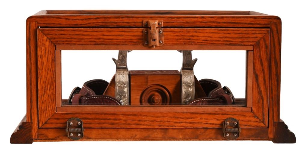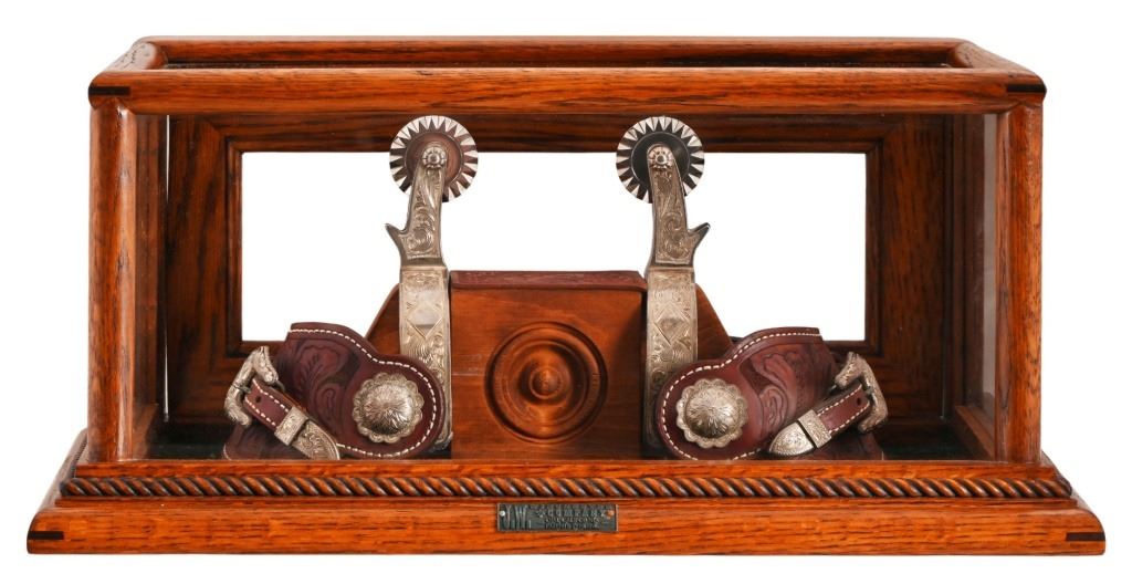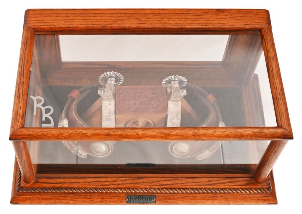 Roy Roger's Bohlin style parade spurs in a custom wood case acquired by Dr. Stark directly from the Roy Rogers & Dale Evans Museum auction. The spurs were displayed in the museum. Custom made spurs by Howie Maxwell are floral engraved silver overlay exact copies of Roy's original Bohlin spurs. In a custom made oak & glass display case made by Winchester case co.