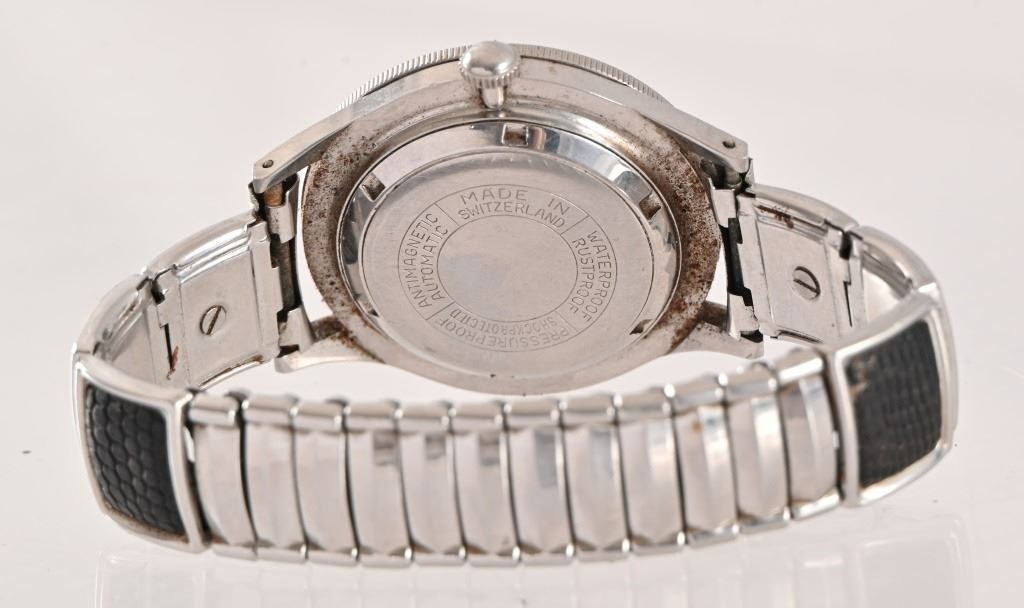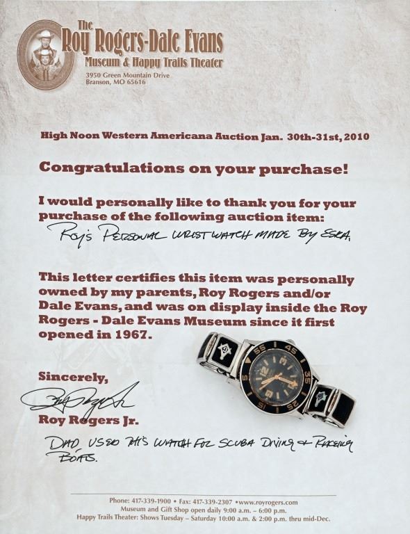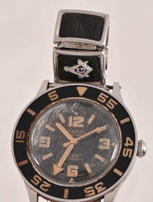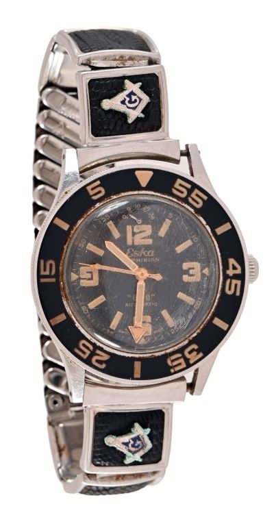 Eska Amphibious "600" Automatic Wrist Watch. Swiss-made. SN 1079. These had bakelite bezel, pressure & water-proof, and shock protected. Expandable stainless steel band boasts Roy's pride as a 33rd Degree Mason, as it is adorned with Masonic emblem. Provenance includes Roy Rogers- Dale Evans Museum COA, signed by Roy Rogers Jr., where he states, "Dad used this watch for Scuba Diving and Racing Boats."
