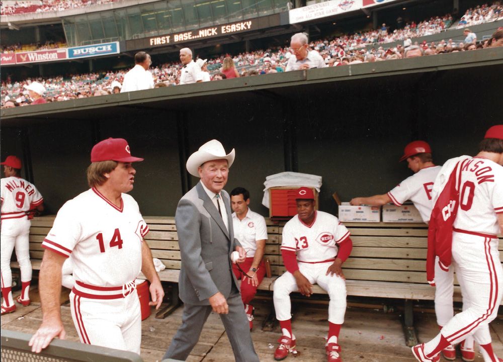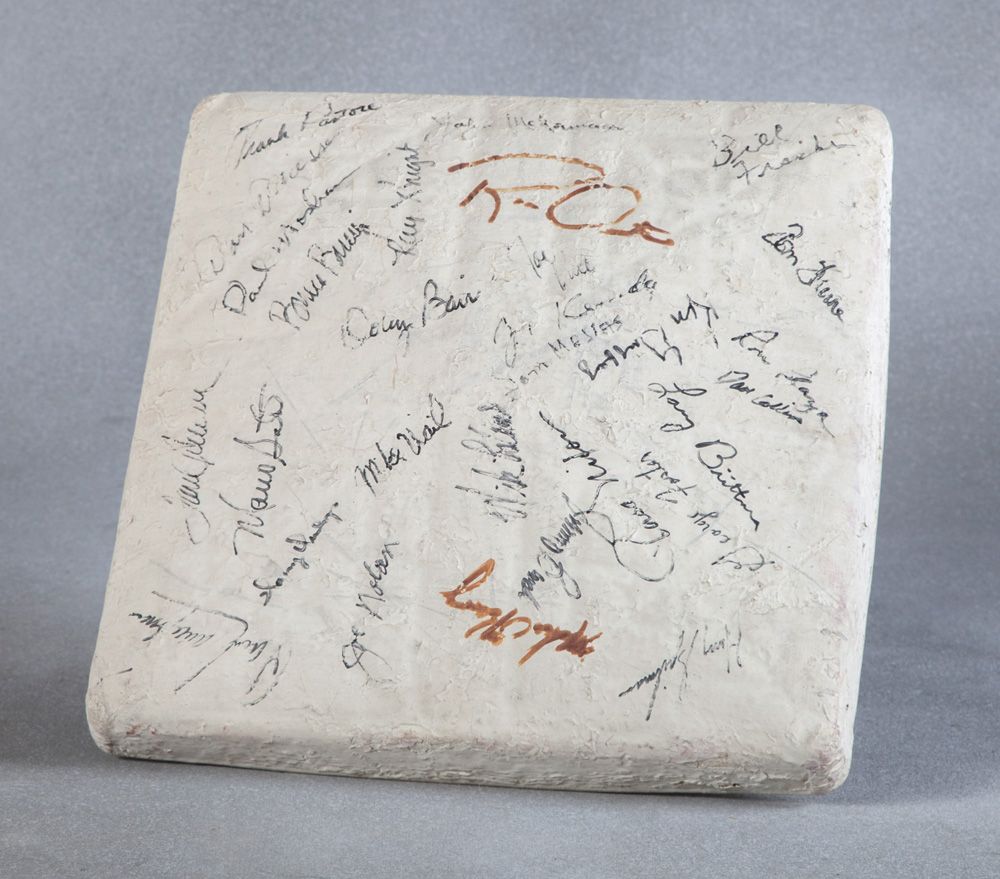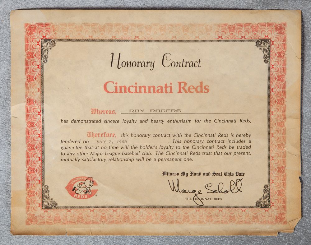 Roy Rogers' Cincinnati Reds Autographed Second Base. Roy Rogers birthplace in Cincinnati was at 412 2nd Street, which was later torn down to build Riverfront Stadium for the Cincinnati Reds Baseball Club. In the early 1980s, Roy and Dusty visited Riverfront Stadium where Roy threw out the first pitch and Dusty sang the National Anthem. While there, Roy staked claim to 2nd base as his birthplace, so Marge Schott, the Reds owner, ordered 2nd base torn up, had it signed by all the players, and presented it to Roy. Notable signatures include Johnny Bench, Ken Griffey, Dan Driessen and others. Includes Roy's "Honorary Contract" with the Reds. Provenance: Roy Rogers and Dale Evans Museum, Victorville, CA and Branson, MO;. to Christie's, July 2010; to present owner. Includes Certificate of Authenticity signed by Roy "Dusty" Rogers, Jr.