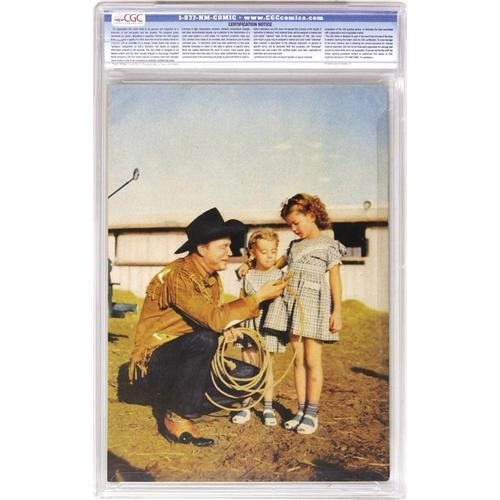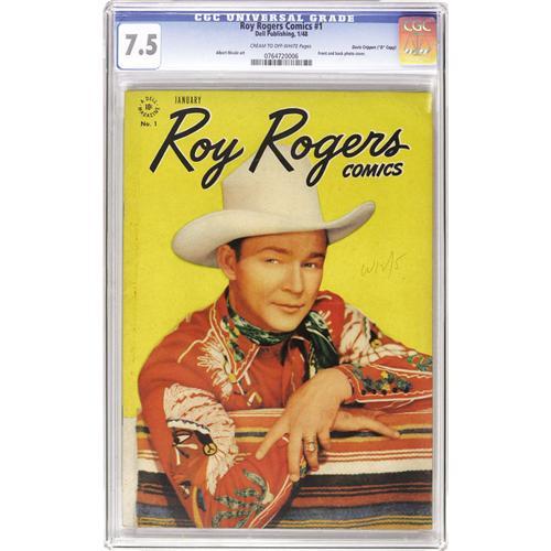 <B>Roy Rogers Comics #1 Davis Crippen ("D" Copy) pedigree (Dell, 1948) CGC VF- 7.5 Cream to off-white pages.</B></I> Here's a nice, clean copy with no strikes against it whatsoever. This #1 issue came on the heels of Mr. Rogers' many <B>Four Color</B></I> appearances and kicked off a 13-year run for the new series. Overstreet 2006 VF 8.0 value = $636. CGC census 7/06: 1 in 7.5, 7 higher. <I>From the Crippen Collection.</B></I> <BR><BR><B>Important notice:</B> Heritage usually auctions material at the rate of 200-250 lots per hour. On some occasions eBay Live bid software or the Internet may not be able to keep up with the pace of the auction. We recommend placing a realistic absentee bid now as insurance to avoid disappointment. Occasionally the auctioneer may eliminate or reject an eBay Live bid, and the auctioneer may also reopen a lot after the close of the eBay live bidding (usually because we missed an audience bid), and may reject your bid even if it shows you as the winning bidder. By bidding via eBay Live, you agree that Heritage may award the lot to another bidder at its sole discretion under the circumstances described above or any other reasonable circumstances. Since eBay bids are not shown to us until we open the lot on the floor, we treat those bids just like floor bids. In most cases the floor responds before the eBay bid is presented to us, due to Internet lag time, so for consistency we have made it a policy that floor bids are always considered first over tie eBay live bids. Also please note that all Heritage lots purchased through eBay Live carry a 22.5% Buyer's Premium. Please make sure you read the Terms and Conditions before you bid. This lot is being auctioned in conjunction with a live floor auction by Heritage Auction Galleries. All final auction and invoice information will be supplied by Heritage Auction Galleries, and all other information should be considered preliminary. Lot:41001 <BR><BR><B>Winning Notification and Billing:</B> After the FINAL session in this auction is complete, Heritage will send e-mail and snail mail invoices. This process normally takes several days. All final auction and invoice information will be supplied by Heritage Auction Galleries, and all other information should be considered preliminary. <BR><BR>This auction will be conducted on a live auction floor and over the Internet through eBay Live. If you choose to place an absentee bid, please take a moment to <font color='#0000ff'><u><a href='http://pages.ebay.com/liveauctions/help/before/laabsentee.html'>learn how eBay Live absentee bidding works</a></u></font><font color='#000000'>