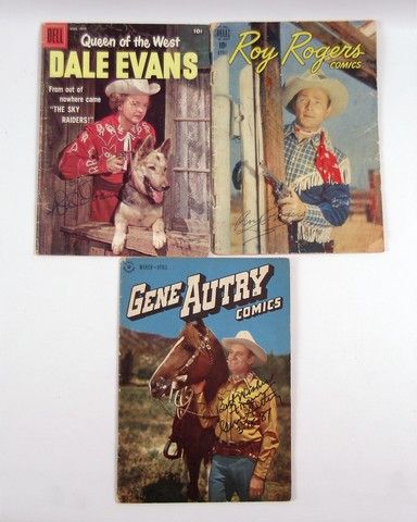 The true triad of cowboy heroes: Roy Rogers, Dale Evans, and Gene Autry. Represented here with three original Dell classic comics: The April 1948 Roy Rogers Comic, signed by Roy Rogers, the April-June Dale Evans comic, signed by Dale Evans, and the March-April 1947 Gene Autry Comic, signed by Autry. The comics are in well read and loved condition!