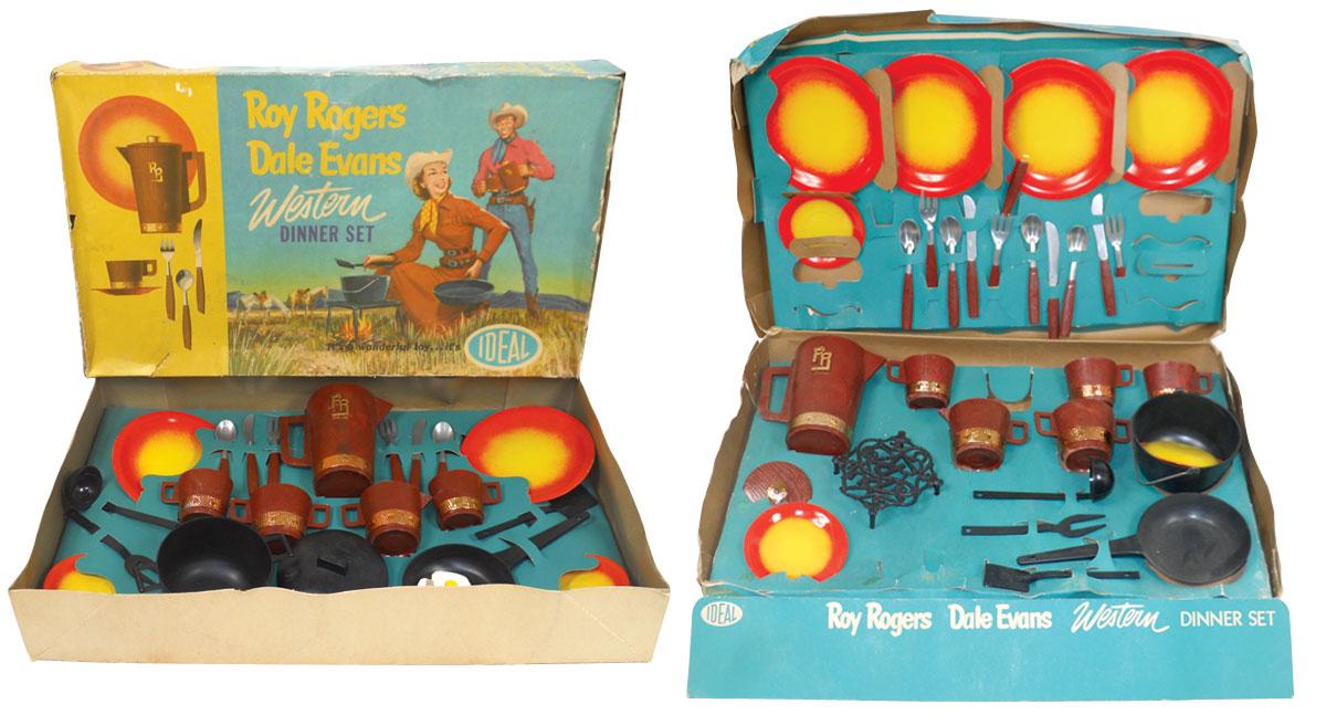 Roy Rogers & Dale Evans Western Dinner Sets (2), 2 & 4 place setting sets, both new old stock, larger set in missing a few pcs, smaller set is complete, both sets in Exc cond in Fair & Good cond orig boxes, 14" x 24".