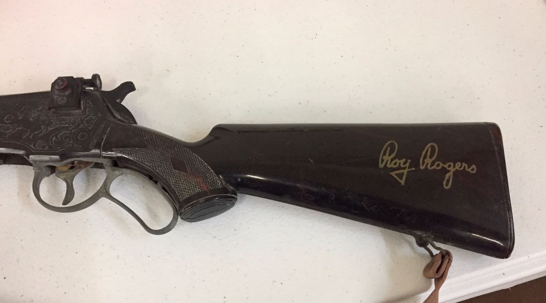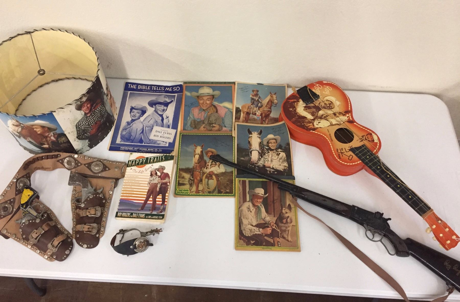 Description: Great grouping of Roy Rogers memorabilia. Lot includes a lamp shade, a small guitar, books/steno pads, toy rifle/pistols. Maker: Various. Approx. Age: Vintage, various. Size: Lamp shade measures 10” tall x 14” in diameter. Guitar measures approx. 27 1/2” l x 10” wide x 2 1/2” tall. Condition: Pretty good for their ages, normal wear expected. Please look closely at the pictures - they are an important part of our description. Shipping: There will be a $15 handling / packaging fee for shipping this lot. The actual cost of postage will be added on top of that.