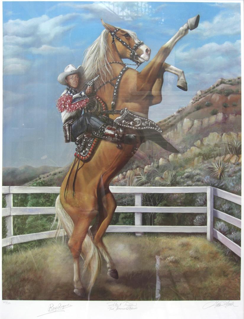Autographed, Roy Rogers Lithograph. "Roy and Trigger, Two American Hero's" Signed by the artist, Gina Faulk and Roy Rogers. It is #220/500. Dimensions - 23" x 30". Framed.