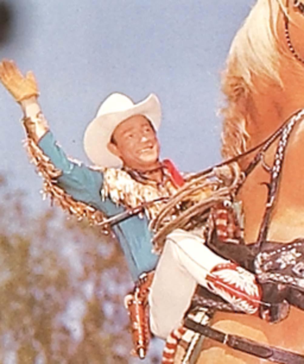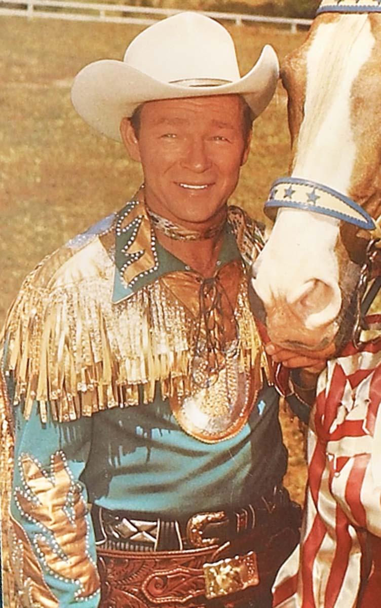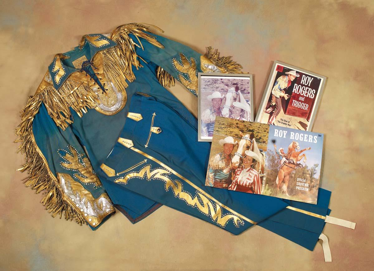 Dazzling two-piece Nudies of North Hollywood blue gabardine suit with gold and silver accents and rhinestone-studded fringe on shoulders and sleeves. Includes an original official Roy Rogers Souvenir Program (c 1950s-60s) of him wearing the shirt on both front and back cover. Also includes two color photocopies of him wearing shirt on a Dell comic and in a photo with Dale and Trigger