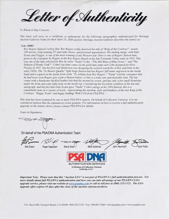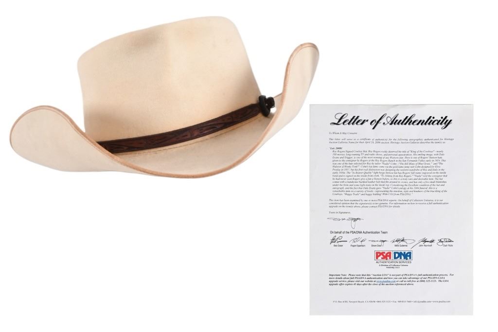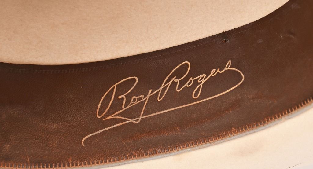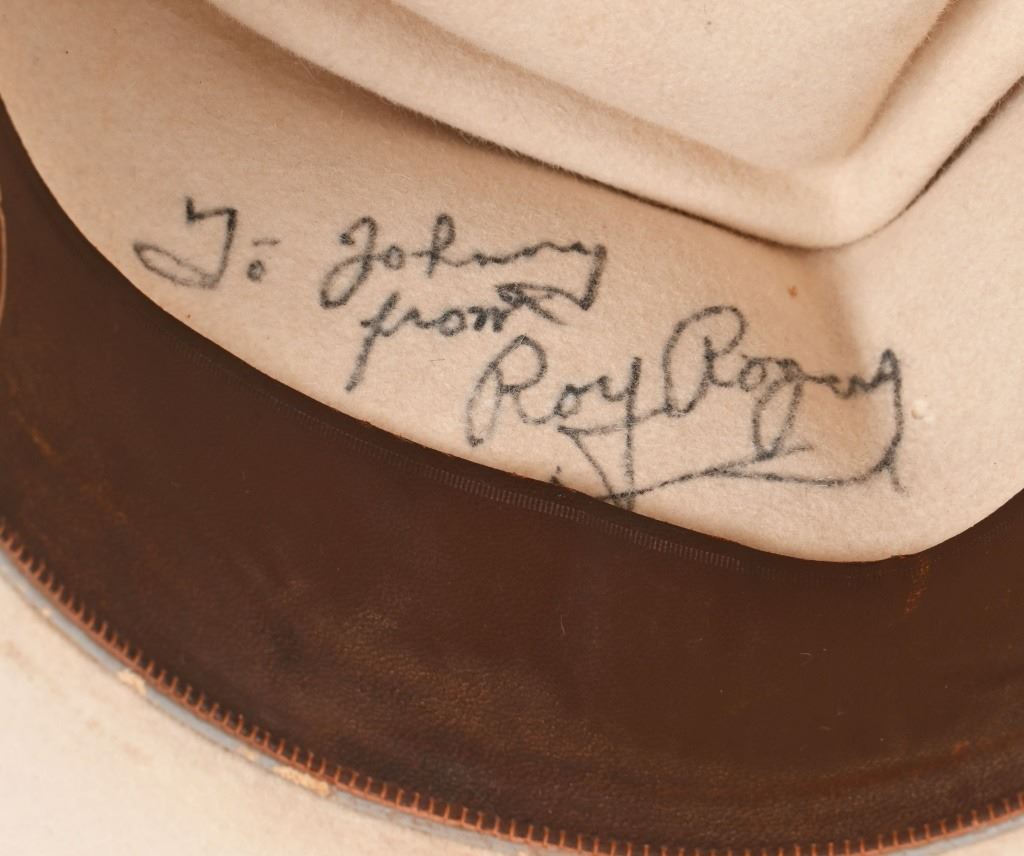 Signed "To Johnny, from Roy Rogers" inside crown. Stetson 3x beaver hat, marked on sweatband. Size 7 1/4