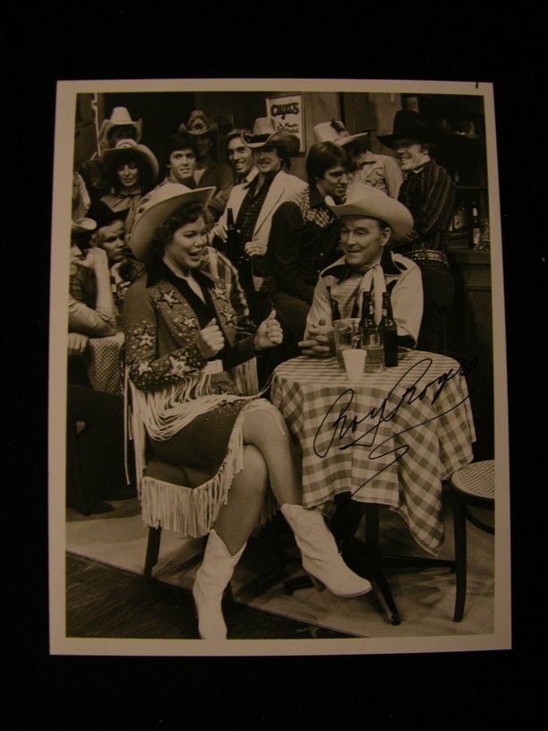 Black and white photo of legendary "singing cowboy" Roy Rogers, seen here sitting with actress Terri Gardner, signed by Rogers in black felt pen. This is an official NBC photograph for the program The Nashville Palace from 1981, with printed information on the back to this regard.