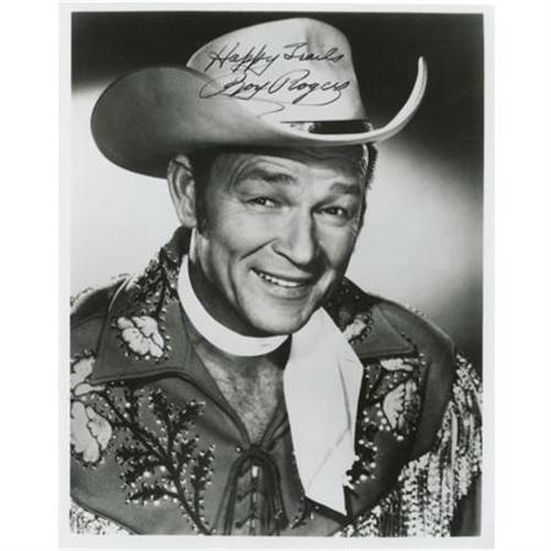 <B>Roy Rogers Signed Photo.</B></I> A b&w 8" x 10" photo of the King of the Cowboys during his later years, inscribed "Happy Trails" and signed by him in black ink. In Excellent condition.<BR><BR><b>Shipping:</b> Flat Material, Small (<a target="_blank" href="http://www.heritageauctions.com/common/shipping.php">view shipping information</a>)