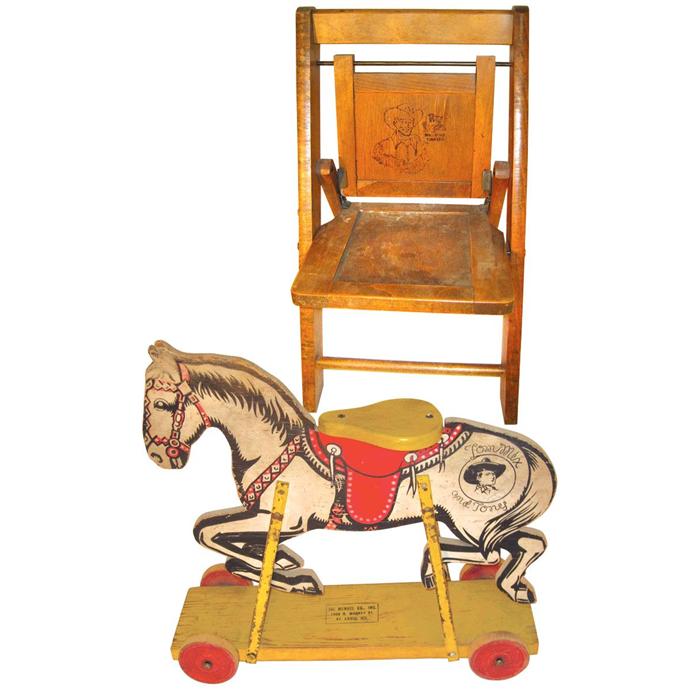 Roy Rogers & Tom Mix toy lot of 2, includes a Roy Rogers child's wooden folding chair, 24"H, Exc orig cond & Tom Mix & Tony child's ride-on horse, mfgd by Megel Co., 16"H x 17"L, Exc orig cond, both items are c.1940's-1950's era.