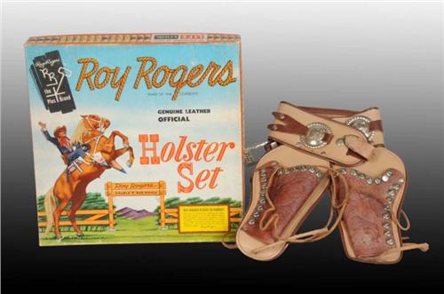 Description Includes original box featuring a nice picture of Roy riding Trigger and marked "1955 Roy Rogers". Lot includes double leather holster with 10 plastic bullets. Roy Roger riding Trigger pictured on the holsters. Marked "RR" on belt buckle and bottoms of the holsters. No guns included with this set. Box has some creasing and shelf wear. Toy (Excellent - Near Mint) Box (Very Good). Size 13" x 13".