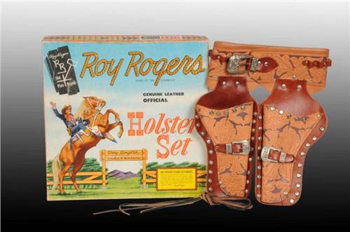 Description Includes original box featuring a nice picture of Roy riding Trigger and marked "1955 Roy Rogers". Lot includes double leather holster with 10 plastic bullets. Marked "RR" on the belt buckle and on the bottom of the holsters. No guns included with this set. Includes a facsimile signature picture of Roy Rogers riding Trigger. Box has some creasing and shelf wear. Toy (Excellent - Near Mint) Box (Very Good). Size Box: 13" x 13".