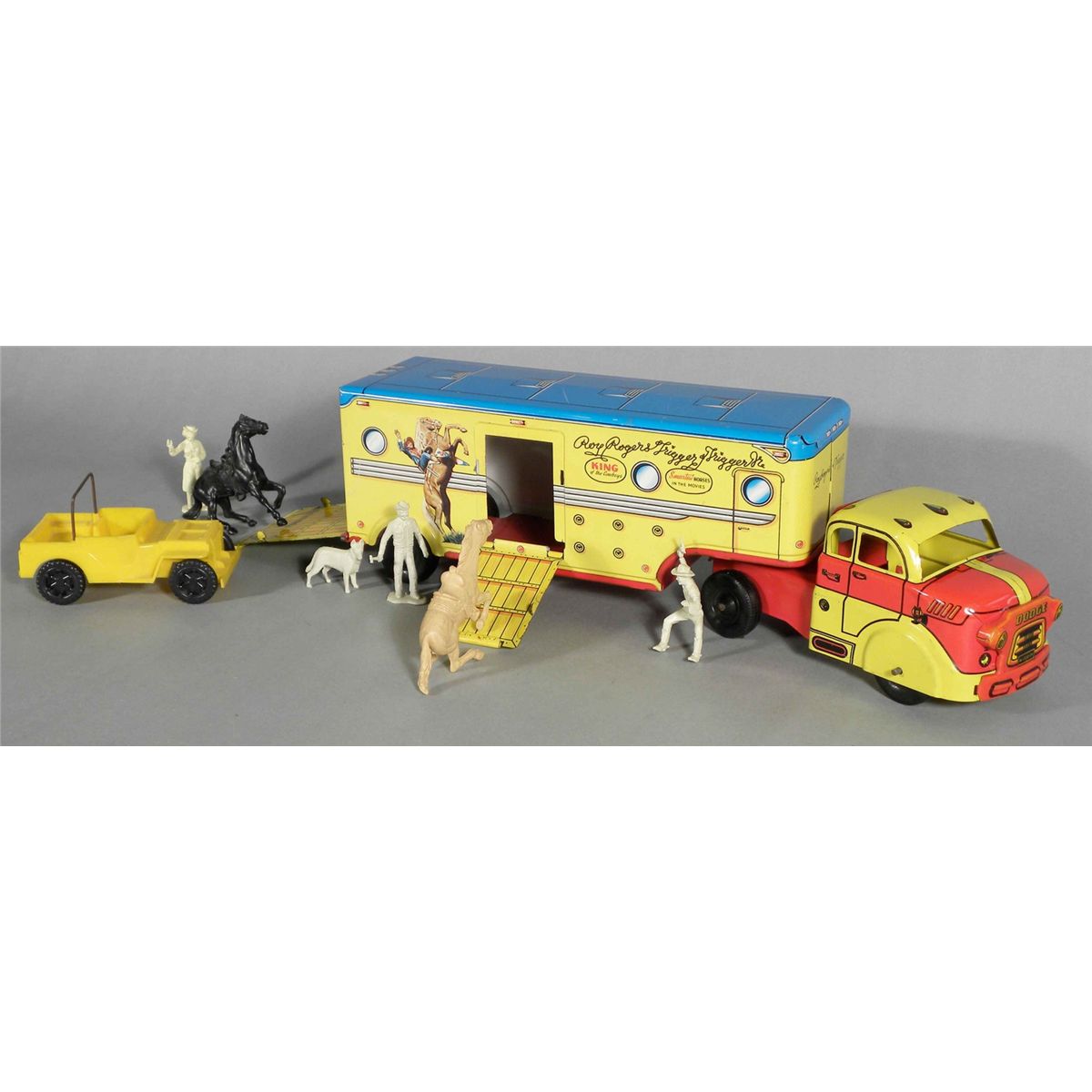 Louis Marx & Co. New York. Roy Rogers, Trigger and Trigger Jr. Horse Trailer. Tin Litho Toy. Comes with figures and "Nellybelle" plastic Jeep. Near mint condition. 15 inches long.