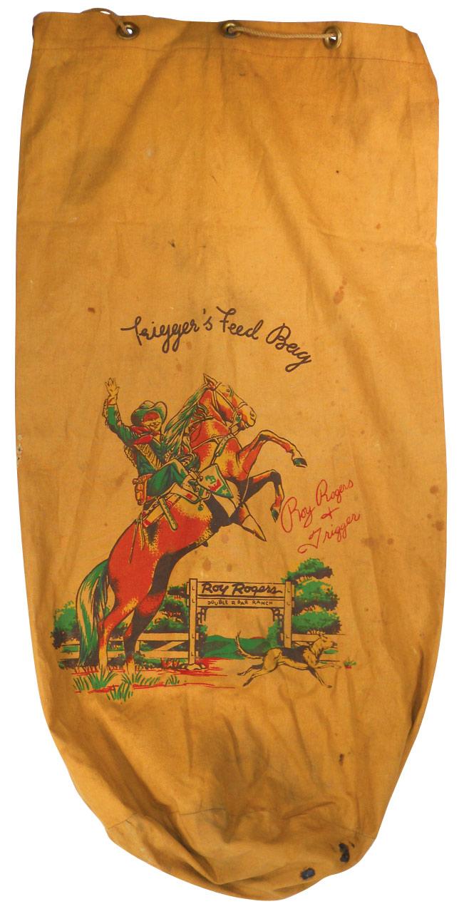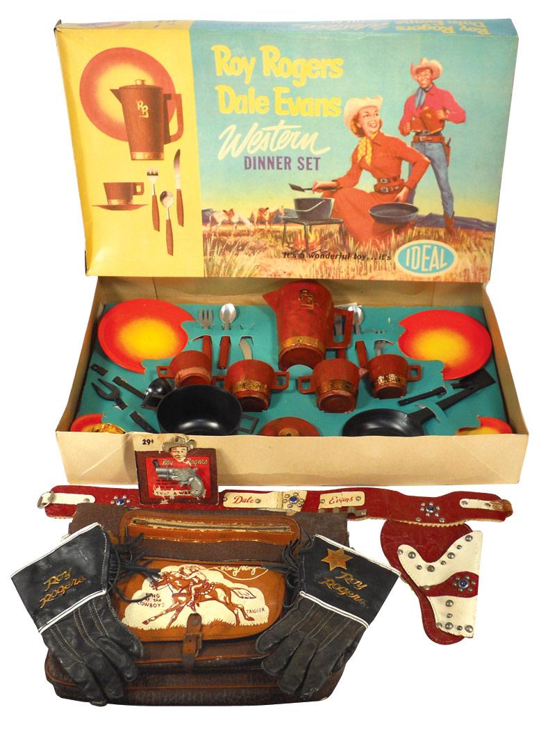 Roy Rogers & Trigger items, includes Ideal Western dinner set, complete in orig box (VG to Exc), laundry bag, (Good to VG), RR leather gloves (Good), Tuck-A-Way Gun on display card (Good), Dale Evans holster (Fair), RR & Trigger book bag (Fair) & Lone Ranger Bond Bread Safety Club badge (Exc).