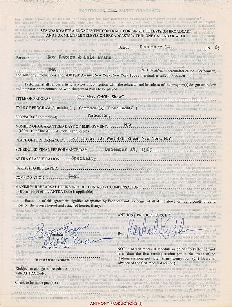 DS, one page, 8.5 x 11, December 14, 1969. Standard AFTRA contract in which Rogers and Evans agree to appear on The Merv Griffin Show on the same day in exchange for $420. Signed at the conclusion in ballpoint by both. A standard AFTRA rider is stapled to the main document in the upper left. In fine condition, with expected document wear.