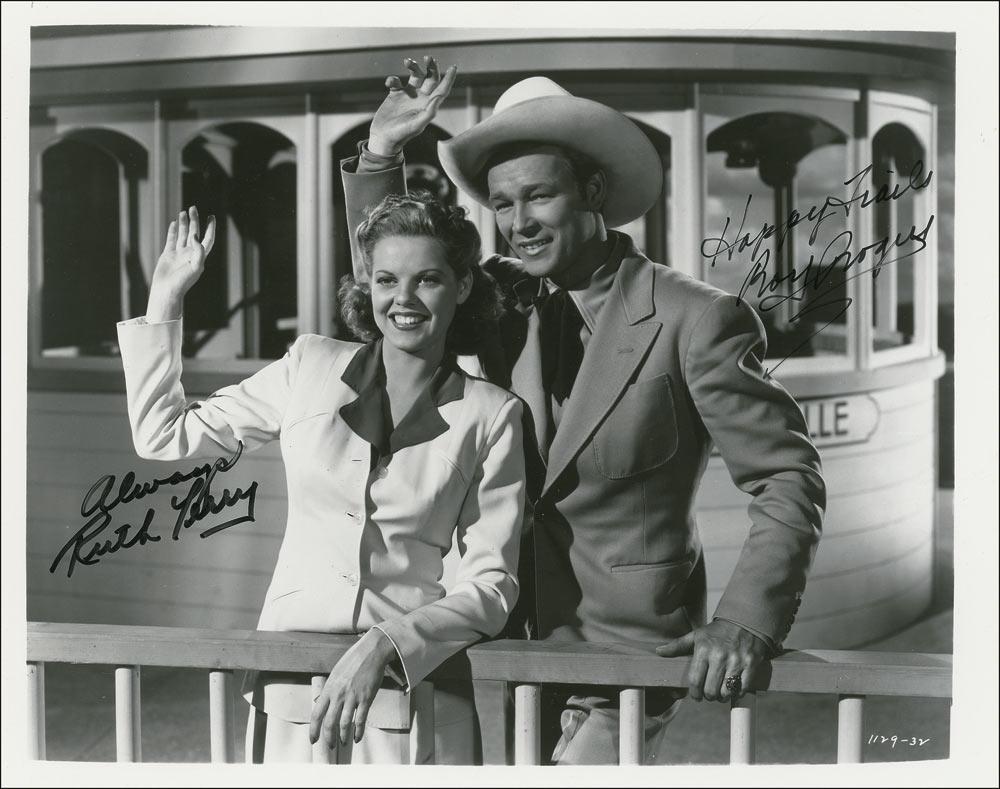 Glossy 10 x 8 photo of Rogers and Terry waving, signed in black felt tip, “Happy trails, Roy Rogers,” and “Always, Ruth Terry.” In very fine condition. Pre-certified PSA/DNA and RRAuction COA.