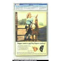 <table><tr><td><TABLE cellSpacing=0 cellPadding=0 width="100%" bgColor=#000000 border=0><TBODY> <TR><TD width="100%"><TABLE cellSpacing=1 cellPadding=3 width="100%" border=0><TBODY><TR><TD width="100%" bgColor=#79735c><FONT face=arial color=#ffffff size=3><B>Description</B> </FONT></TD></TR><TR><TD width="100%" bgColor=#ffffff><FONT face=arial size=2><B>Roy Rogers and Trigger #123 File Copy (Dell, 1958) CGC NM 9.4 Off-white pages.</B></I> Roy is looking good in his fancy Western shirt on the cover of this colorful issue. Inside, you'll find some great art by Alex Toth; and the back cover features an ad for Roy's own line of children's clothing and toys, as modeled by some lucky young lad seen petting Roy's horse, Trigger. This very attractive copy currently ranks as best in the CGC census. Overstreet 2003 NM 9.4 value = $90. <B>Estimate: $100-up</B> </FONT></TD></TR></TBODY></TABLE></TD></TR></TBODY></TABLE><BR><!--<a name="PricesRealized"></a> <table width="100%" border="0" cellspacing="0" cellpadding="0" bgcolor="#000000"> <tr> <td width="100%"> <table width="100%" border="0" cellspacing="1" cellpadding="3"> <tr> <td width="100%" bgcolor="#79735C"> <a name="PR"> <font face="arial" size="3" color="#FFFFFF"> <b>Previous Prices from Heritage Auctions</b> </td> </tr> <tr> <td bgcolor="#F6F6ED"> No Prior Data Recorded </td> </tr> <tr> <td bgcolor="#FFFFFF"> <font face="arial" size="1""> PLEASE NOTE: All prices realized reflect the final hammer price PLUS the buyer's premium in auctions that charge a buyer's premium. Each item has a notation at the top of the listing indicating whether that lot included a buyer's premium. Example: A item that sells with a final hammer price of $100 and a 15% buyer's premium will display with a price realized of $115. All information listed is intended to be as accurate as possible, but errors are possible. Please use this guide carefully and inform us of any inaccuracies. </td> </tr> </table> </td> </tr> </table>