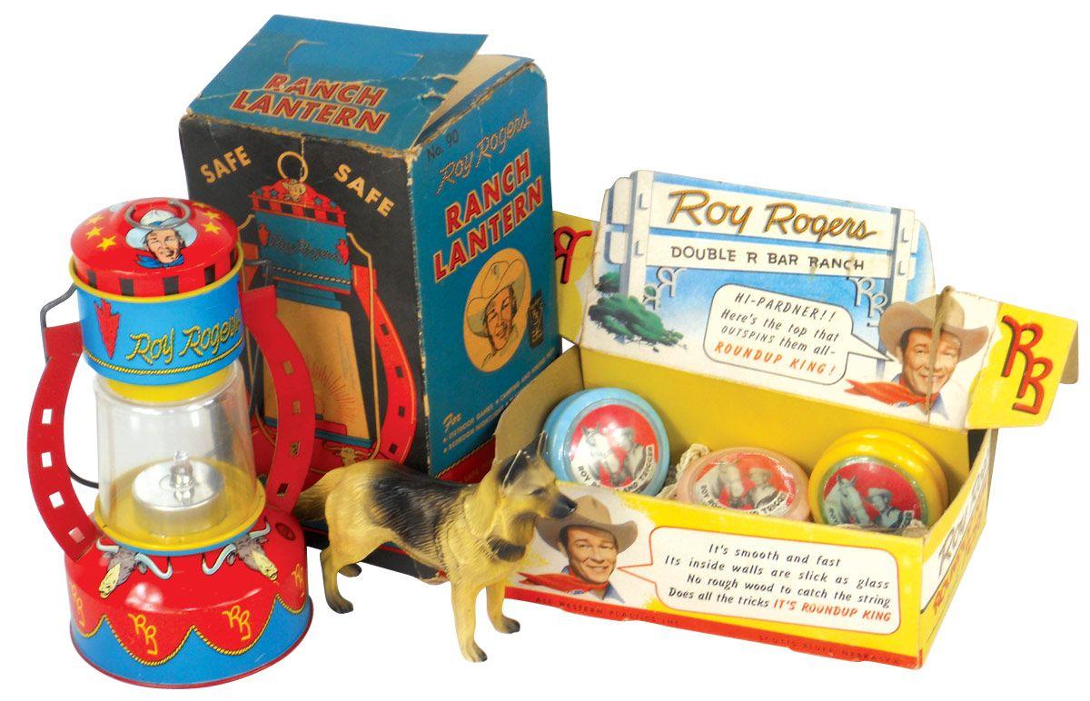 Roy Rogers toys (3), Ranch Lantern by Ohio Art in orig box, Bullet the Dog by Hartland & 5 Roy Rogers yo-yo's in display box by Western Plastics, all 1950's, VG to Exc cond.