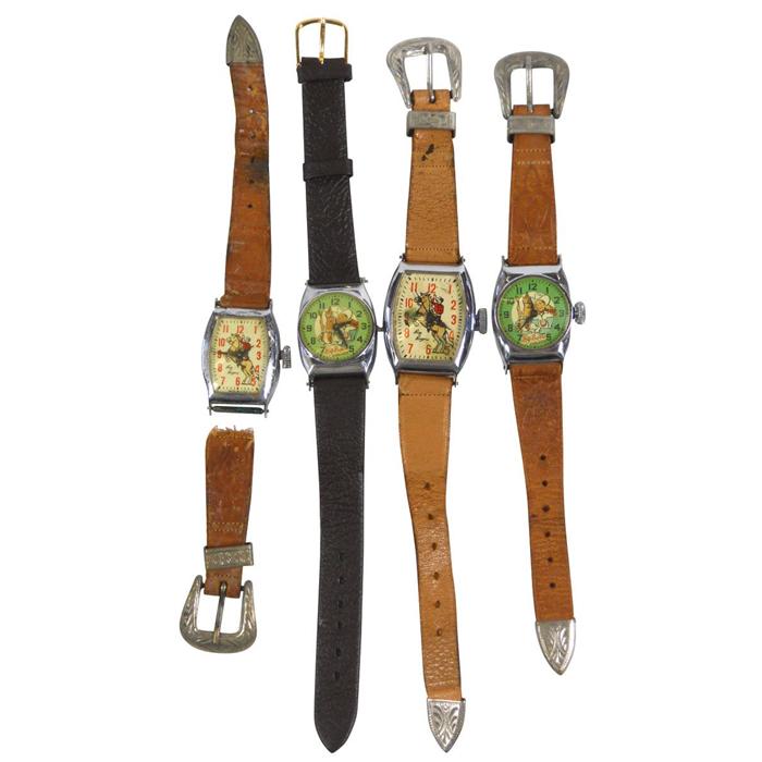 Roy Rogers wrist watches (4), 2 different styles, one style in 2 sizes, one w/broken band, one w/spots on face & one missing knob on stem, other in VG cond.