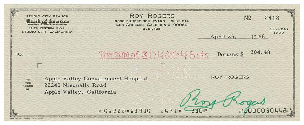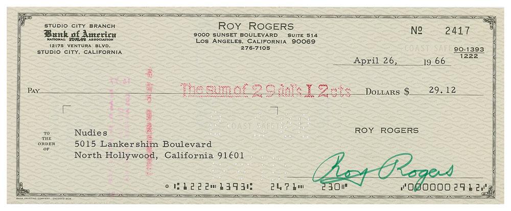 Two business checks all filled out in type and signed by Rogers, each dated April 26, 1966. One check is payable to the Apple Valley Convalescent Hospital and the other to Nudies—a famous tailor to the major cowboy and country music stars of the era. Expected cancellation stamps and holes, otherwise fine condition.