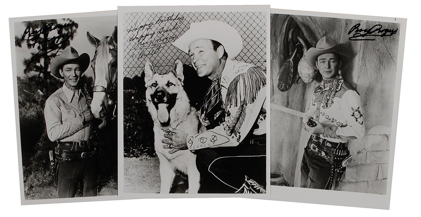 Three glossy 8 x 10 signed promotional photos of Rogers, Bullet, and Trigger, signed in black ink, “Happy Birthday, Happy Trails, Roy Rogers & Bullet;” in black felt tip, “Roy Rogers,” and “Roy Rogers, Trigger.” In overall fine condition, with some dark contrast to the signature of the photo with Trigger.