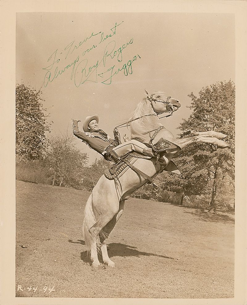 Vintage glossy 8 x 10 photo of Rogers atop a rearing Trigger, signed and inscribed in green ink “To Irene, Always our best, Roy Rogers & Trigger.” In very good condition, with light irregular ink adhesion to signature and inscription, a few bends and creases, and horizontal and vertical crazing and streaking to finish.