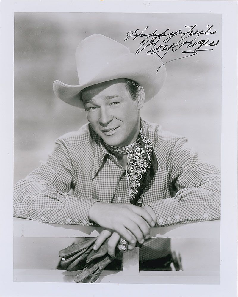 Glossy 8 x 10 photo of Rogers leaning on a fence, signed in black felt tip, “Happy Trails, Roy Rogers.” In fine condition, with a few trivial bends to top border.