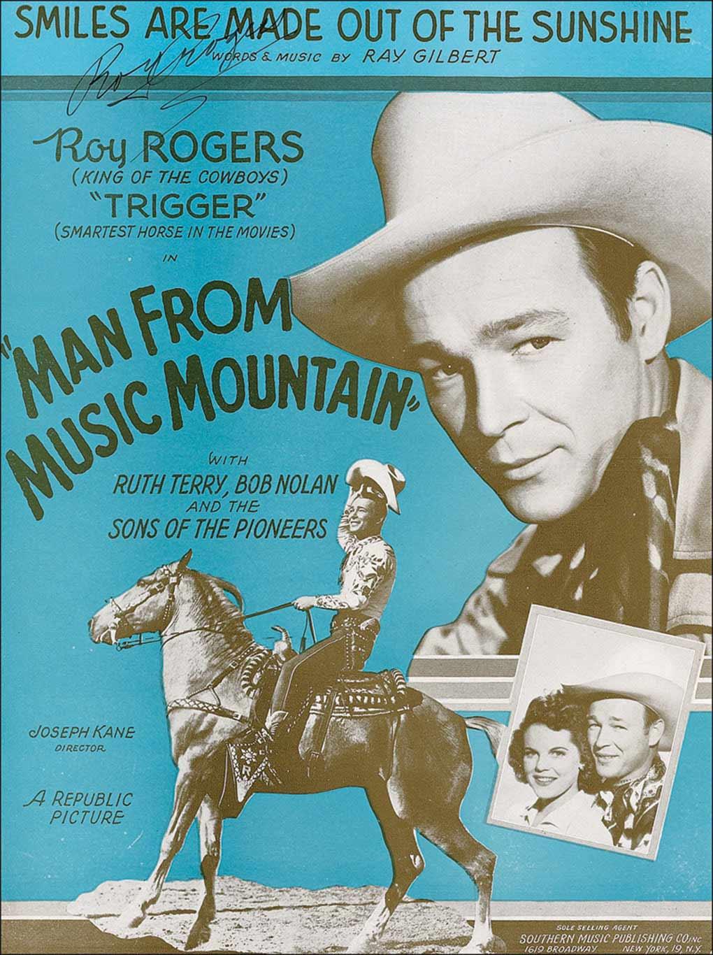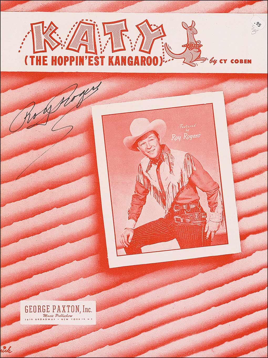 Two sets of sheet music, both 9 x 12, one of “Katy” (The Hoppin’est Kangaroo), and one of “Smiles Are Made Out of Sunshine” from the film Man from Music Mountain, each signed on the front cover in black ink by Rogers. In fine condition, with light contrast to one signature, and a small price label to other cover.