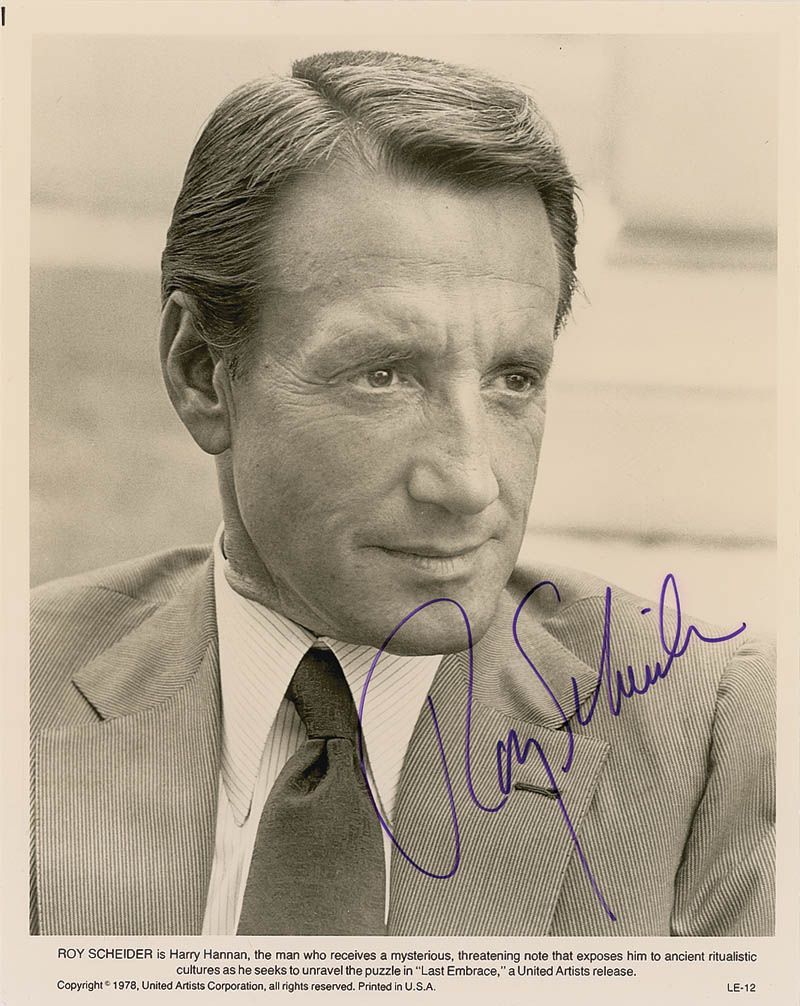 Glossy 8 x 10 United Artists promotional photo for Last Embrace, signed in purple felt tip. In fine condition.