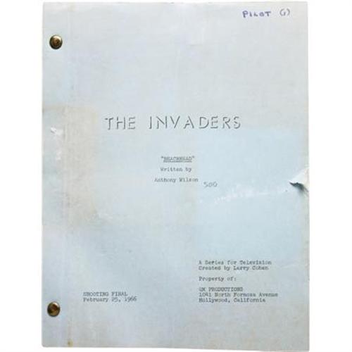 <B>Roy Thinnes "The Invaders" Pilot Script with Handwritten Notes.</B></I> TV producer Quinn Martin masterfully drew upon two sources -- <I>The Fugitive</B></I> and <I>Invasion of the Body Snatchers</B></I> -- to create the classic '60s sci-fi series <I>The Invaders.</B></I> Roy THinnes starred in the paranoia-drenched series as David Vincent, a man on the run trying to single-handedly halt an alien invasion and "convince a disbelieving world, that the nightmare has already begun." This is Thinnes' personal copy of the final shooting draft of the series' pilot episode, dated February 25, 1966, with several handwritten notes by Thinnes. A unique item, in Fine to Very Fine condition with moderate wear to the front cover. <I> From Roy Thinnes' Collection.</B></I><BR><BR><b>Shipping:</b> Books & Catalogs (<a target="_blank" href="http://www.heritageauctions.com/common/shipping.php">view shipping information</a>)