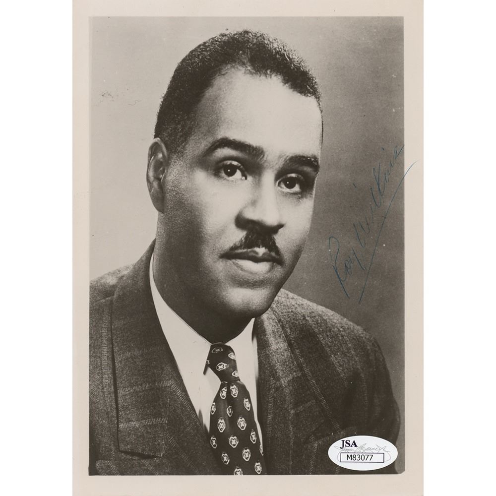 American leader of the Civil Rights Movement (1901-1981) who was active in the NAACP. Glossy 5 x 7 head-and-shoulders photo of Roy Wilkins in a suit and tie, signed in blue ballpoint. In fine condition, with a JSA label affixed to the lower corner (certificate of authenticity not present).