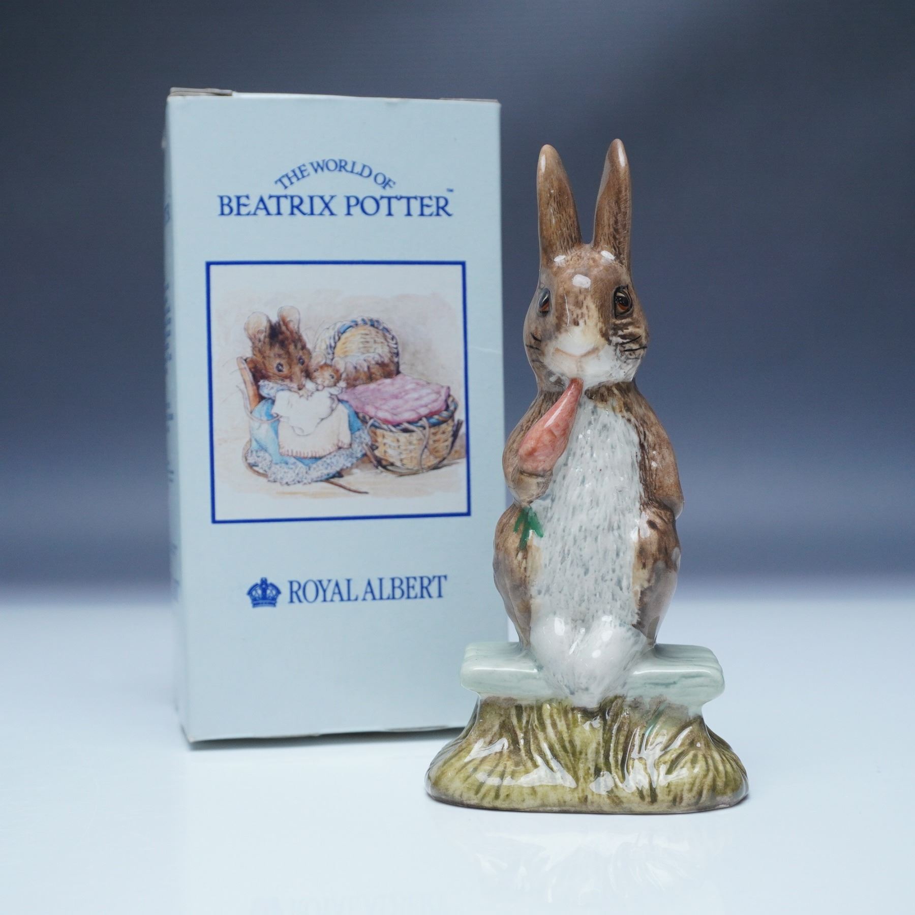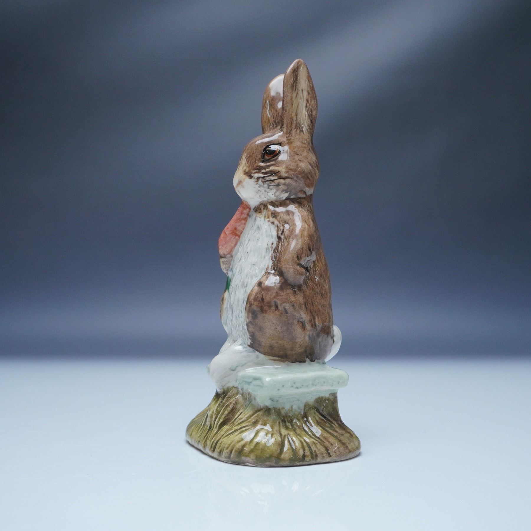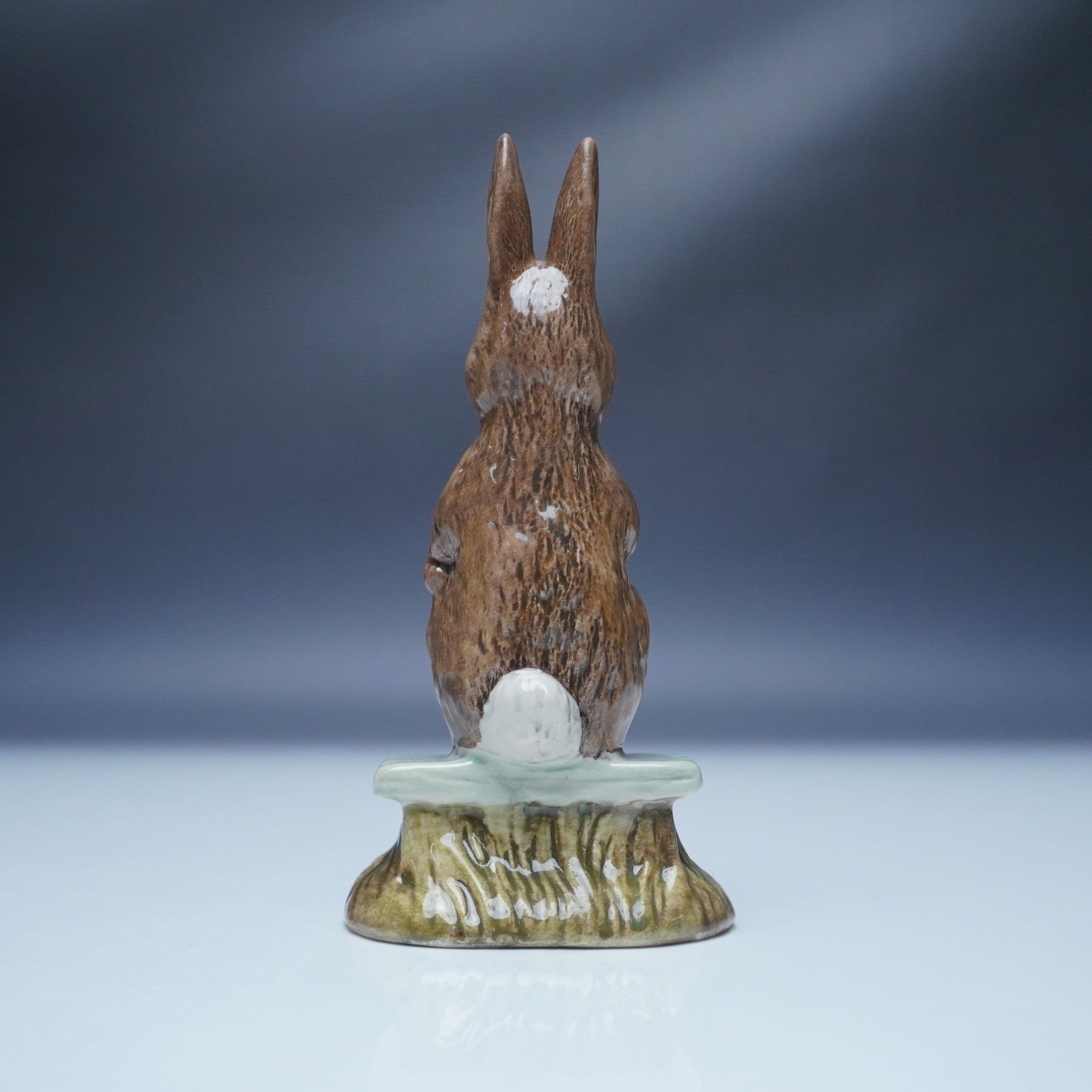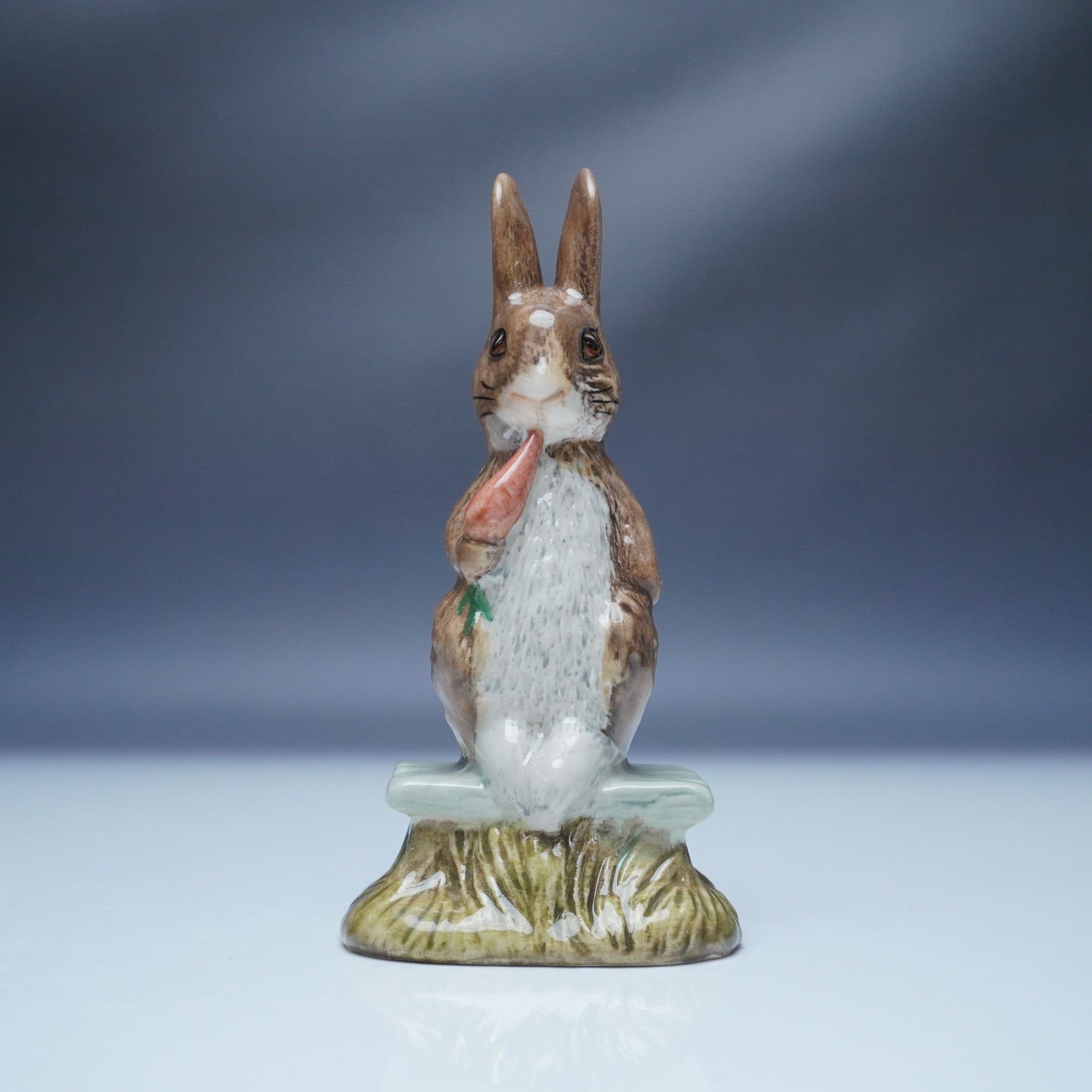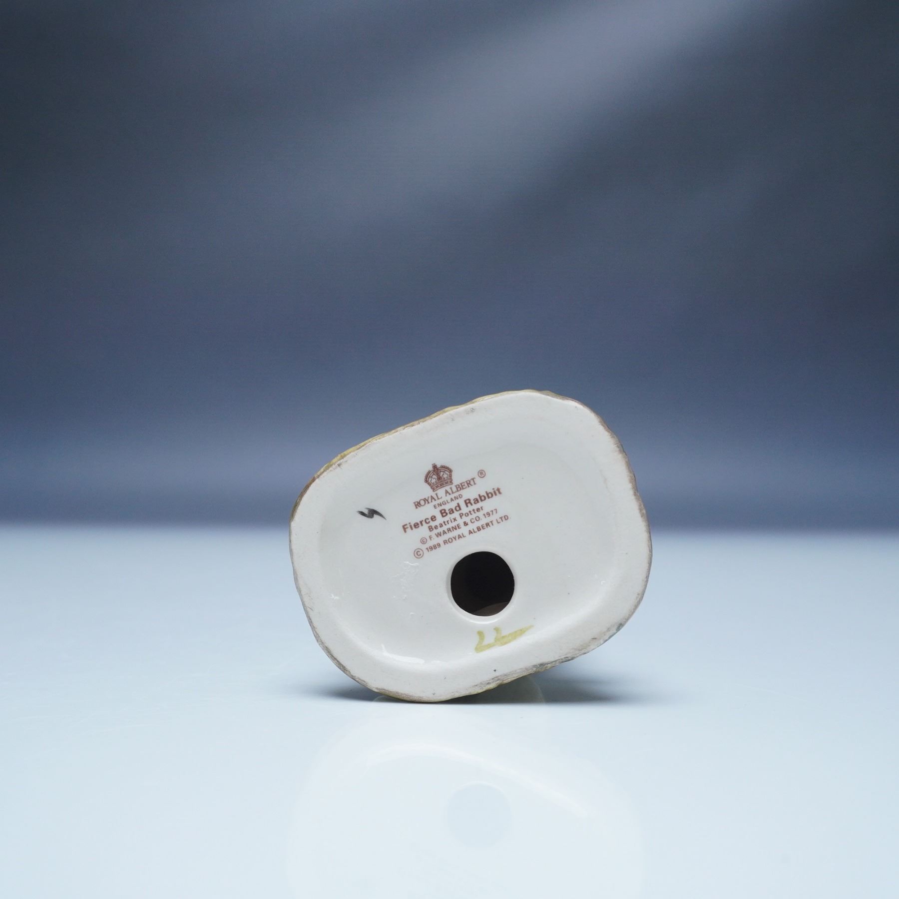 This Royal Albert porcelain figurine brings to life Fierce Bad Rabbit, a character from Beatrix Potter's beloved stories. The rabbit is depicted seated on a textured grassy base, holding a bright orange carrot while exuding a bold and defiant demeanor. Beautifully hand-painted with intricate details, the figurine captures the natural fur tones, expressive face, and lifelike stance of the character. Produced by Royal Albert, this officially marked piece upholds the brand's legacy of fine craftsmanship. Complete with its original box, this collectible is a wonderful addition for Beatrix Potter enthusiasts and figurine collectors alike.
