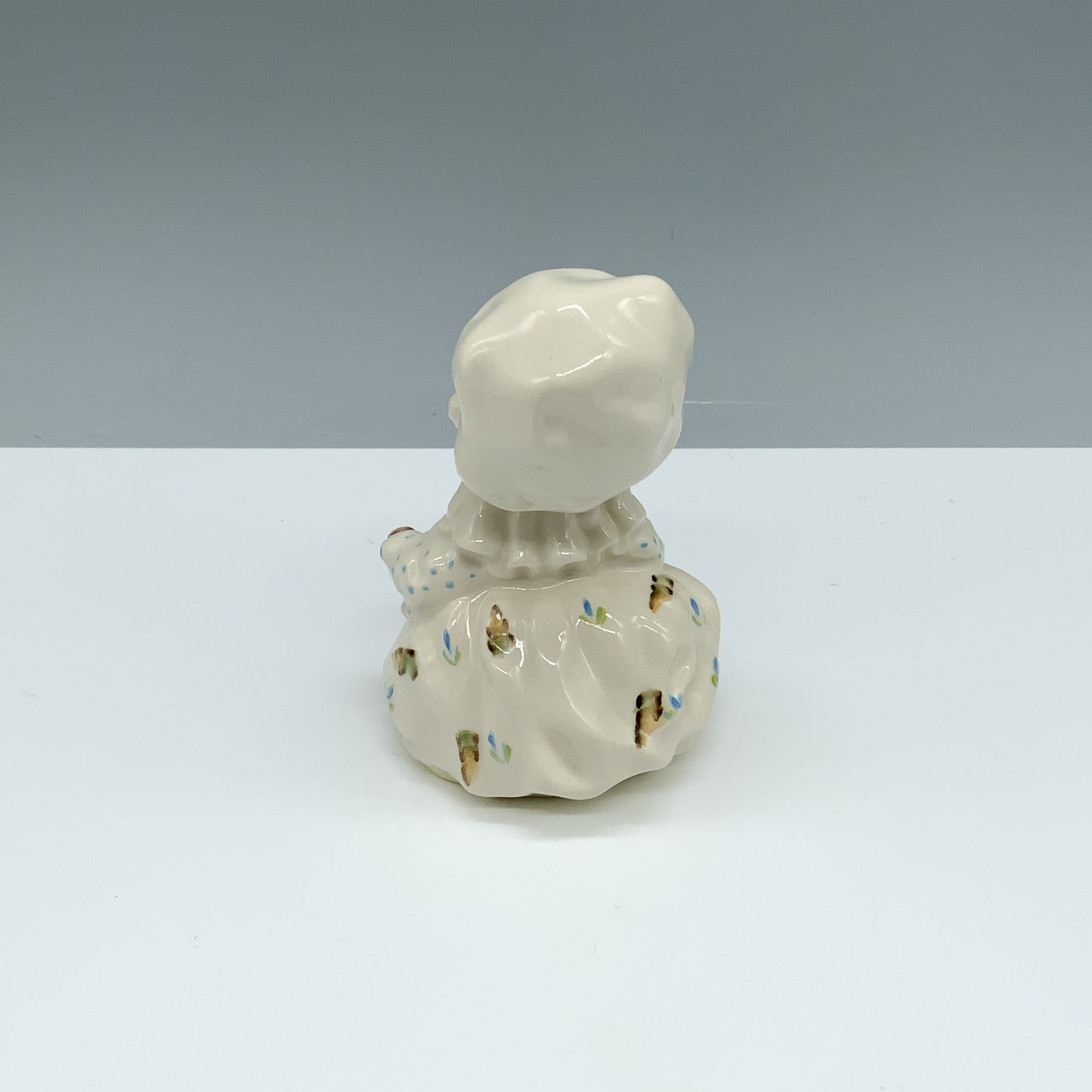 Glossy porcelain figure of a critter with an elaborate dress and bonnet. Royal Albert Beatrix Potter backstamp. This item has its original box (3"L x 3"W x 4.25"H).