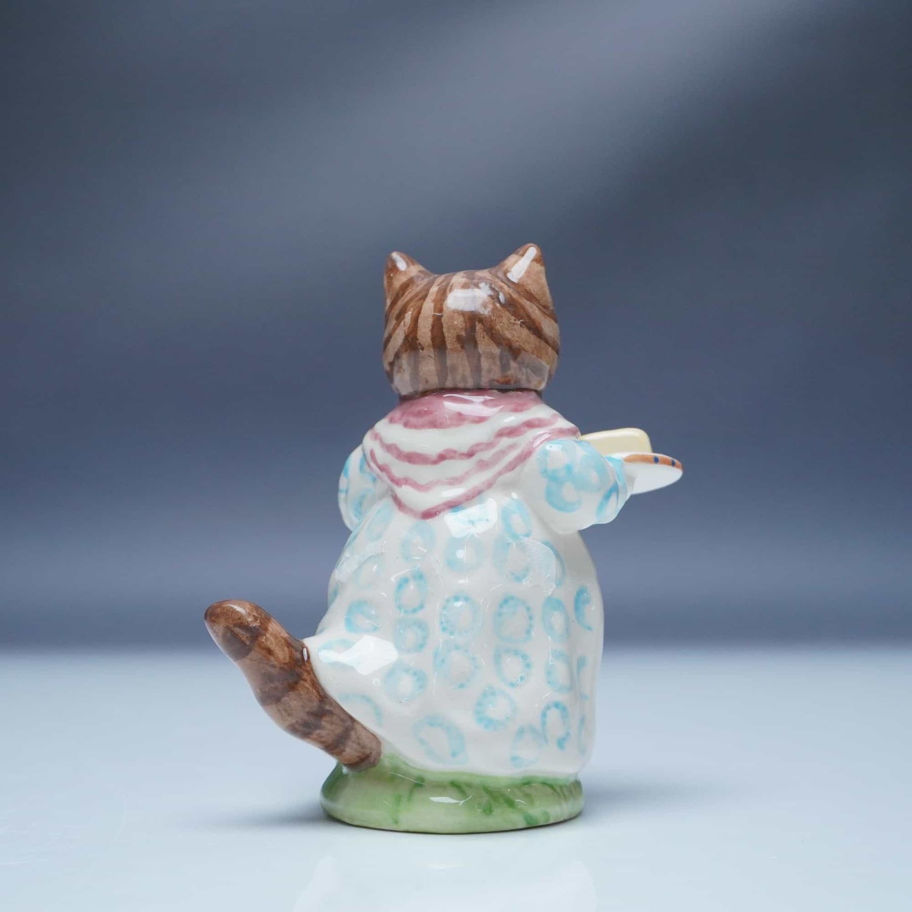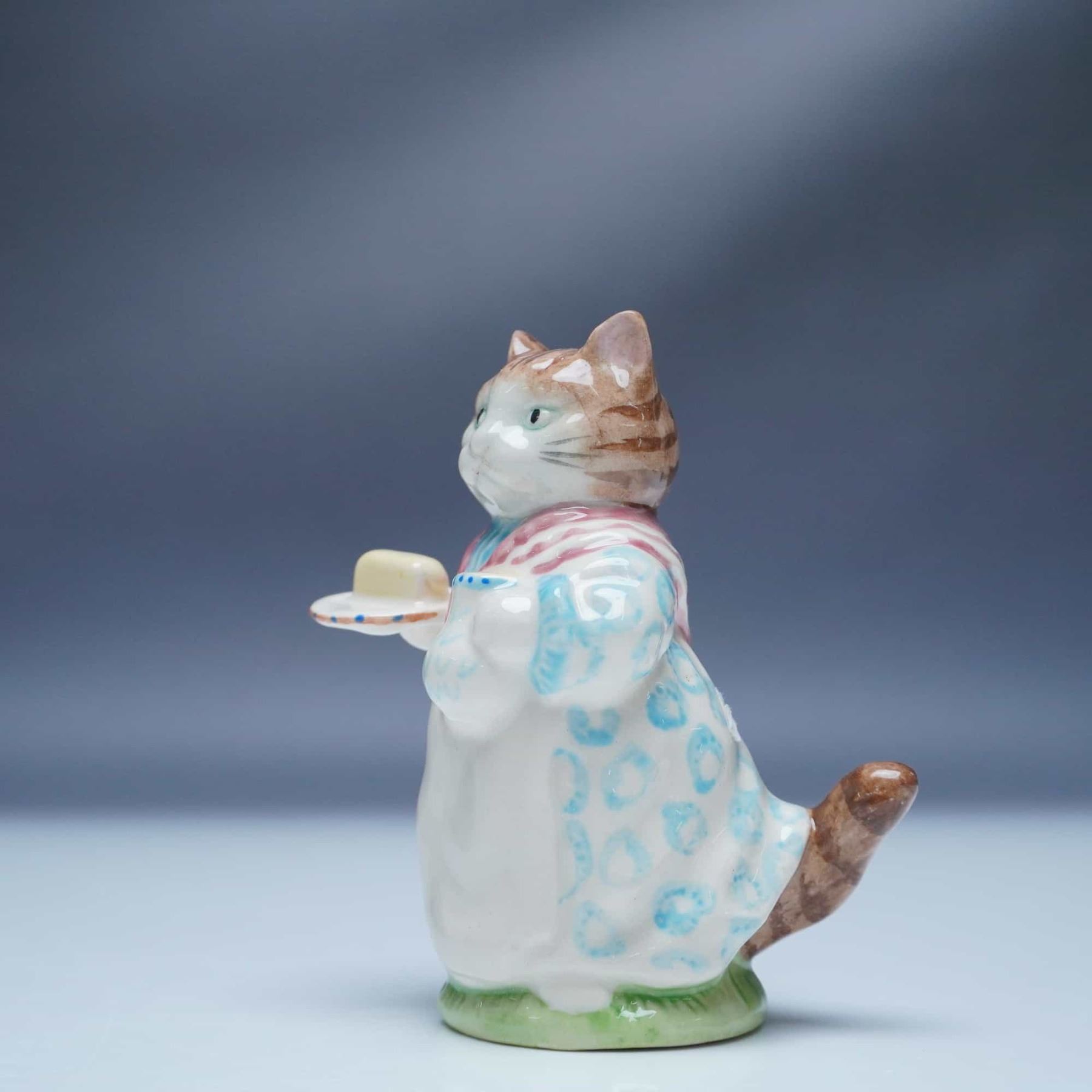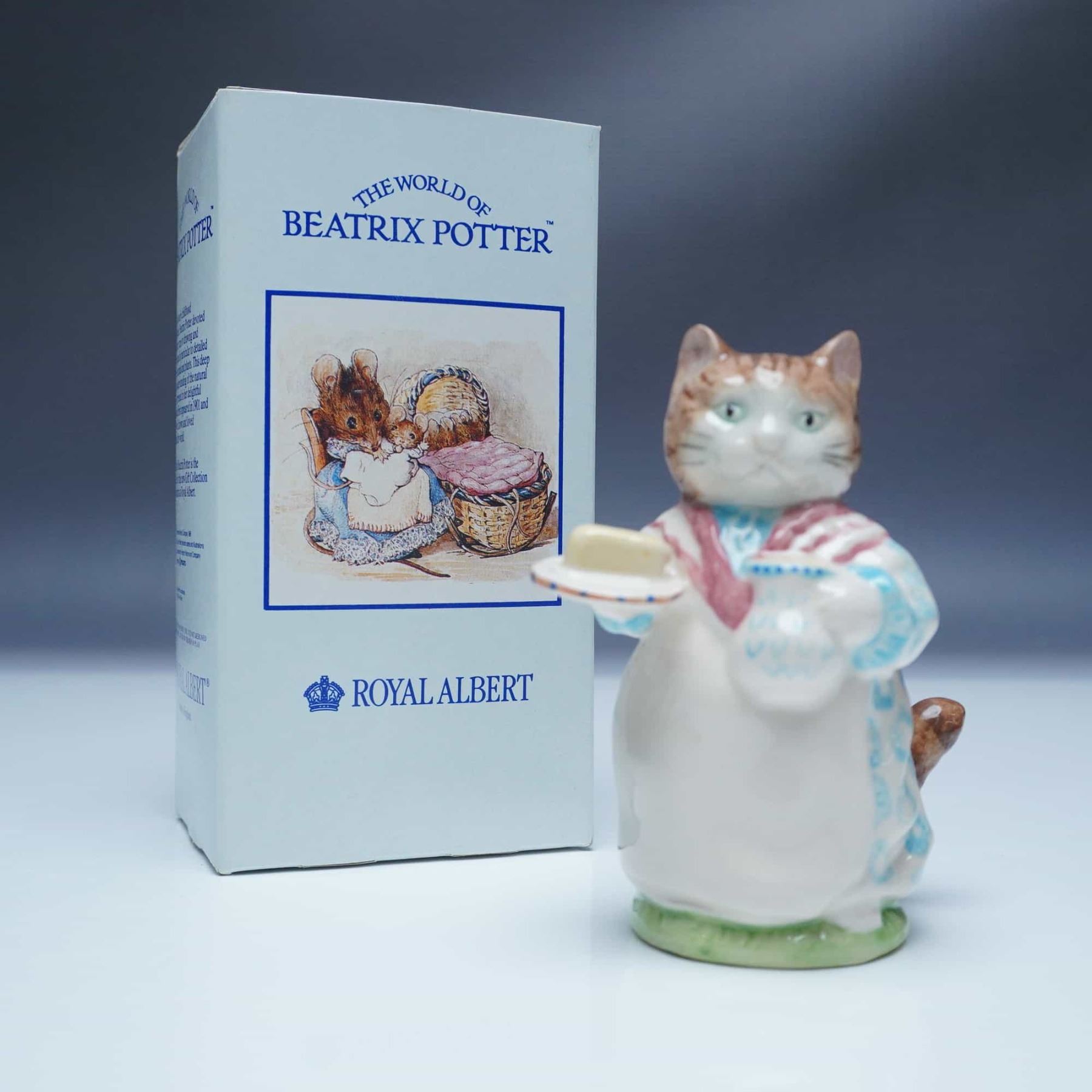 This charming porcelain figurine from the Royal Albert Beatrix Potter collection features Mrs Ribby, the well-known feline from Beatrix Potter's beloved tales. Portrayed with a warm expression, she is dressed in a traditional long gown with blue and white patterns and a red scarf, holding a plate with a serving of butter and a jug. Beautifully crafted with hand painted details, this figurine captures the essence of Potter's timeless storytelling. It bears the Royal Albert backstamp and retains its original box. A delightful collectible for enthusiasts of Beatrix Potter's works and fine porcelain figurines.