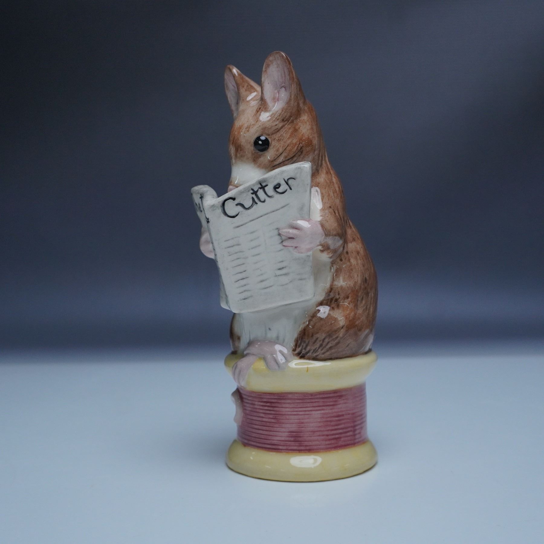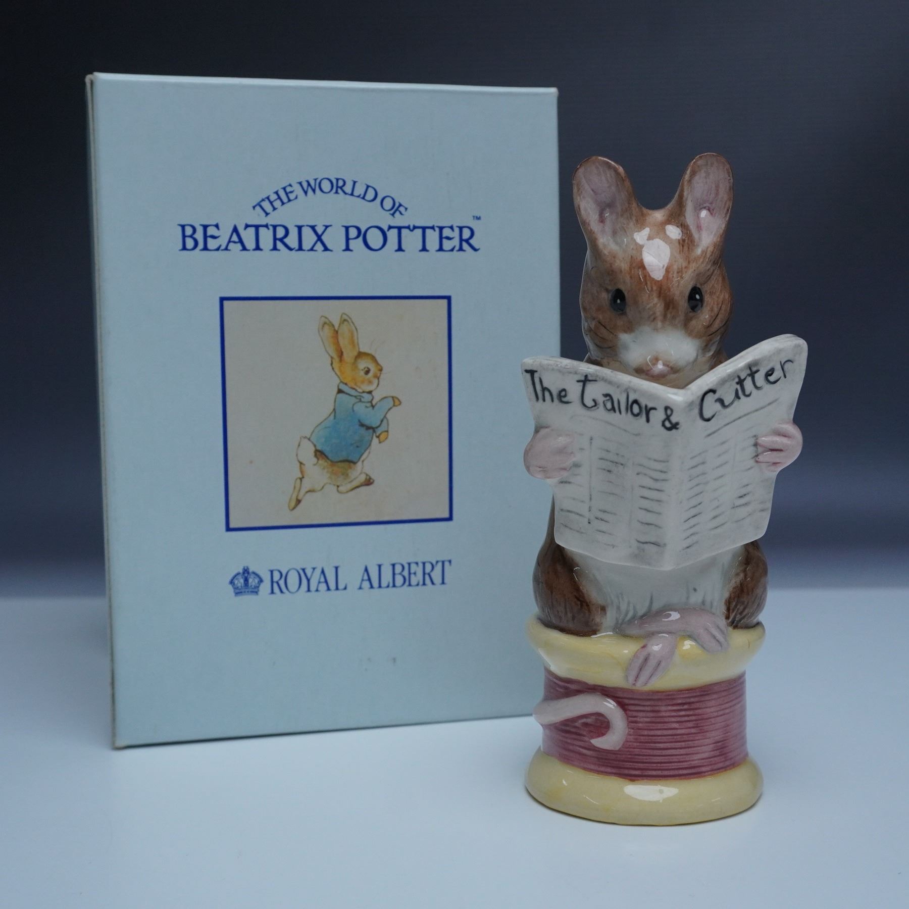 Royal Albert Beatrix Potter figurine titled The Tailor of Gloucester, depicting a charming mouse reading a newspaper while sitting atop a spool of thread. Crafted from fine bone china, this figurine is inspired by Beatrix Potter's beloved children's stories. The underside bears the Royal Albert backstamp along with the copyright date of 1994. Beautifully hand-painted with intricate details and a glossy finish. A wonderful collectible for Beatrix Potter enthusiasts. This item has its original box.