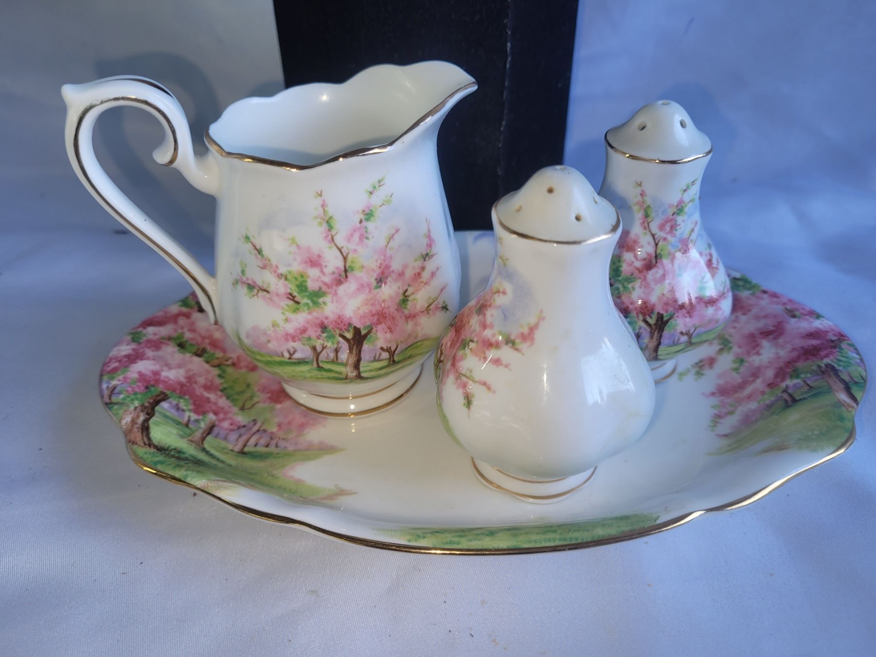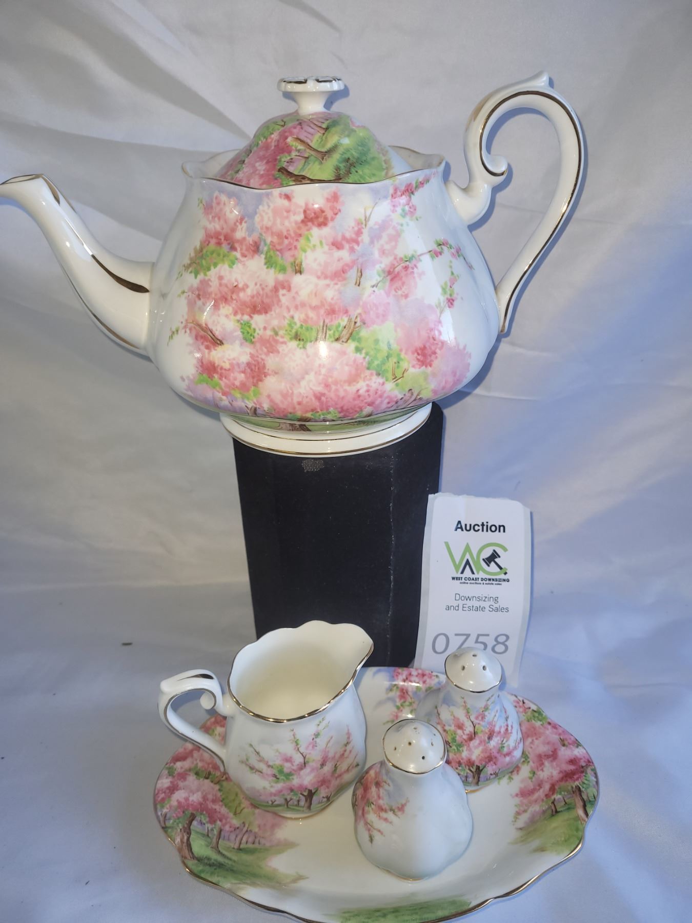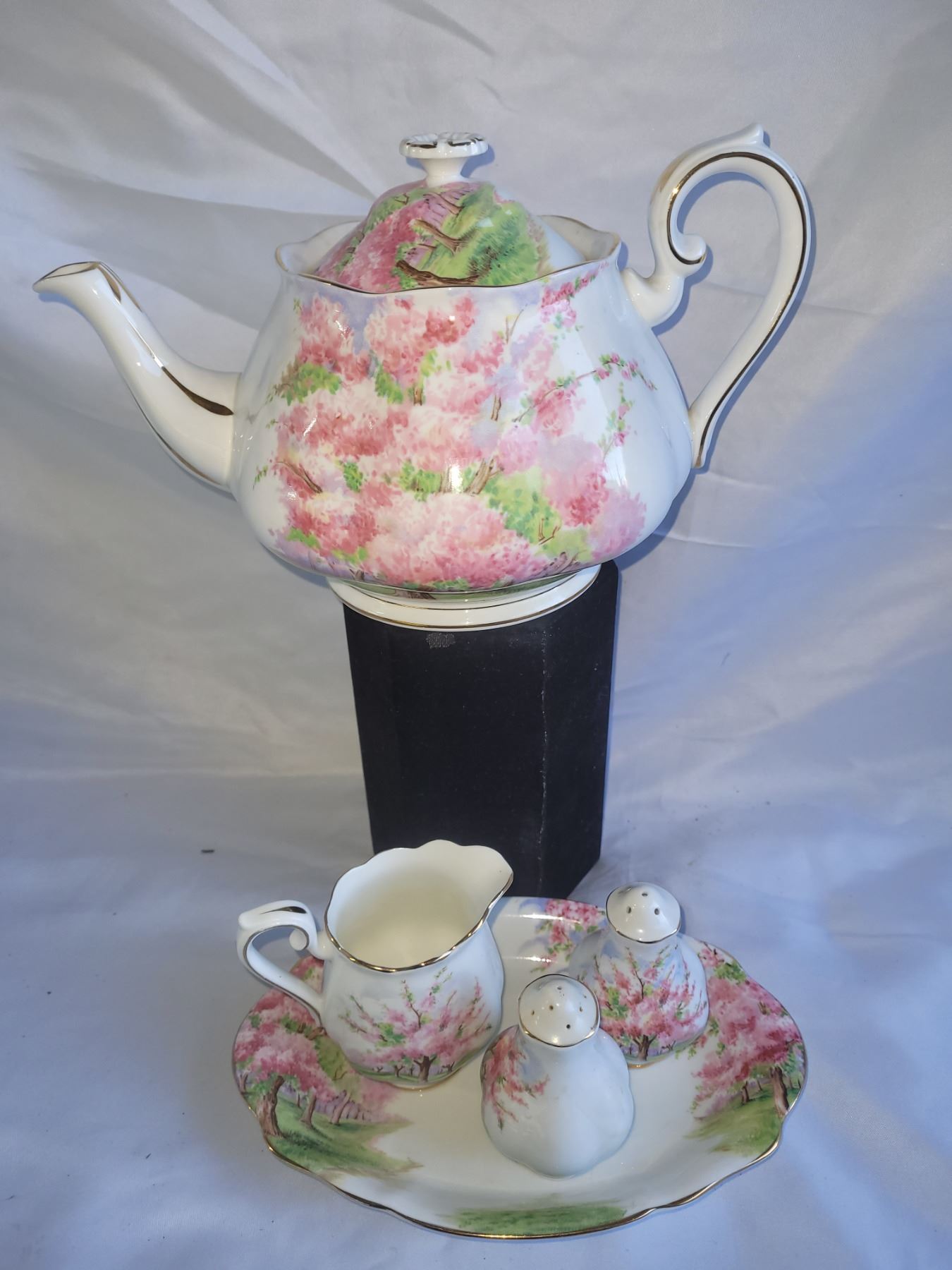 Teapot, creamer, no sugar bowl. Salt & pepper and small serving platter. Pickup at 9 am