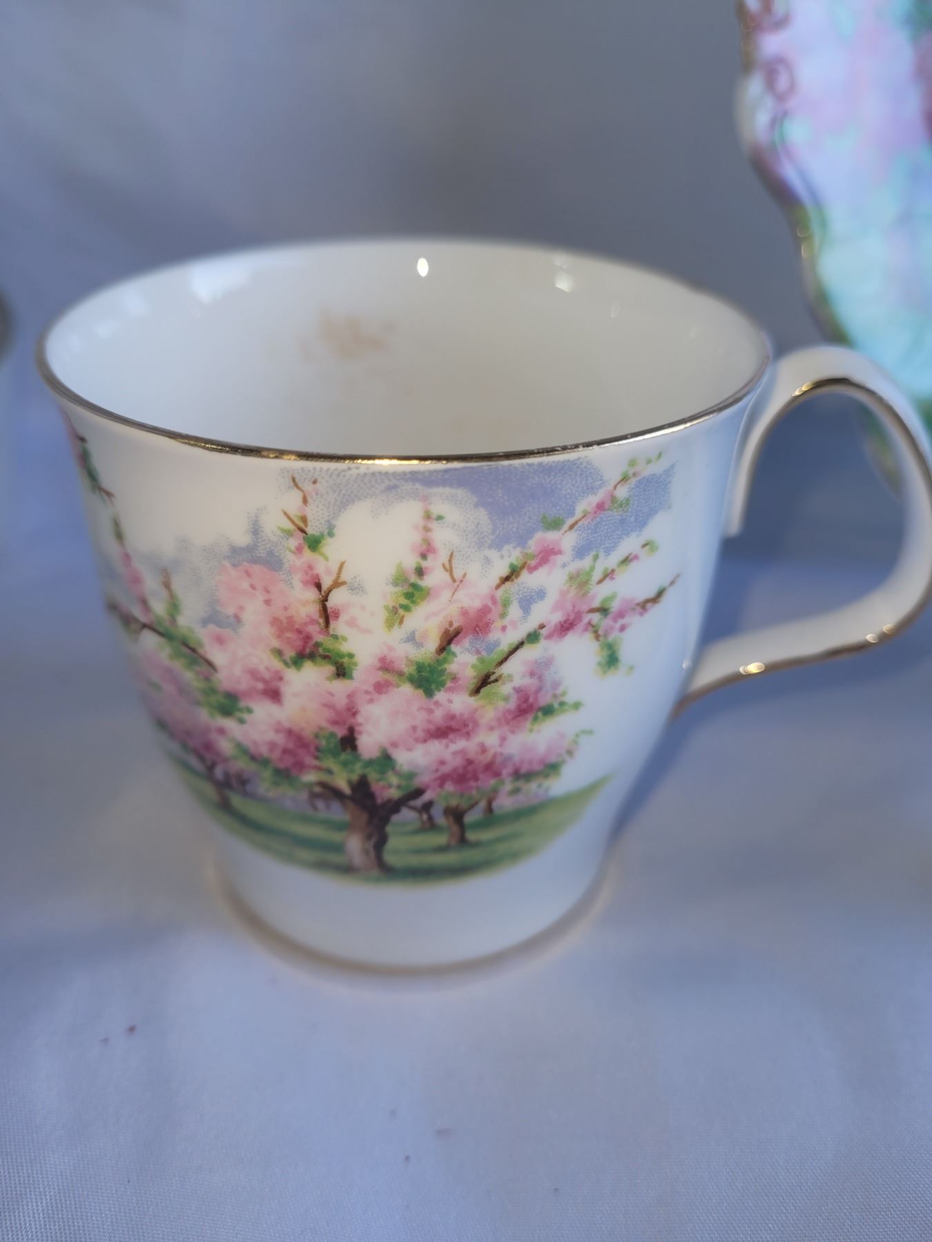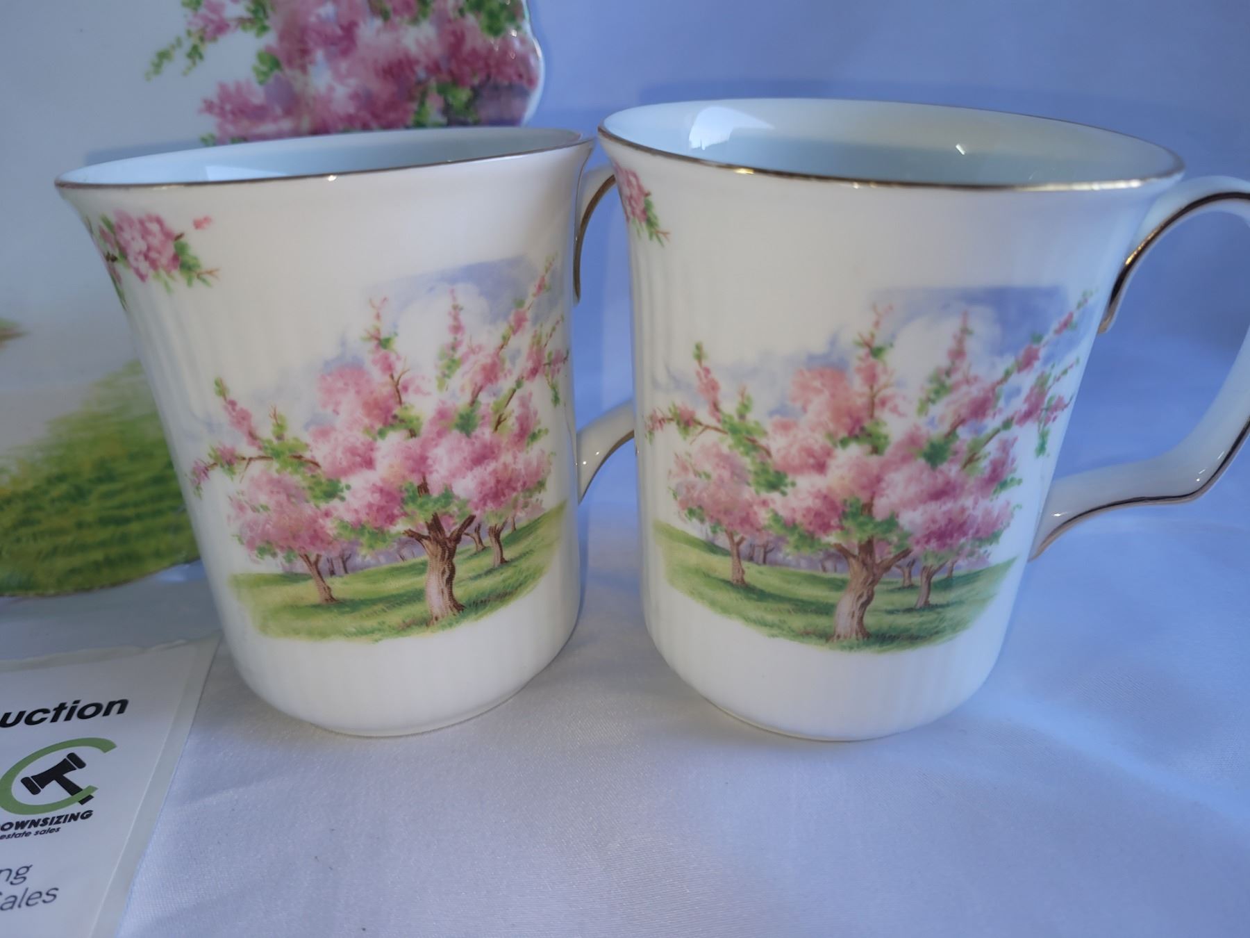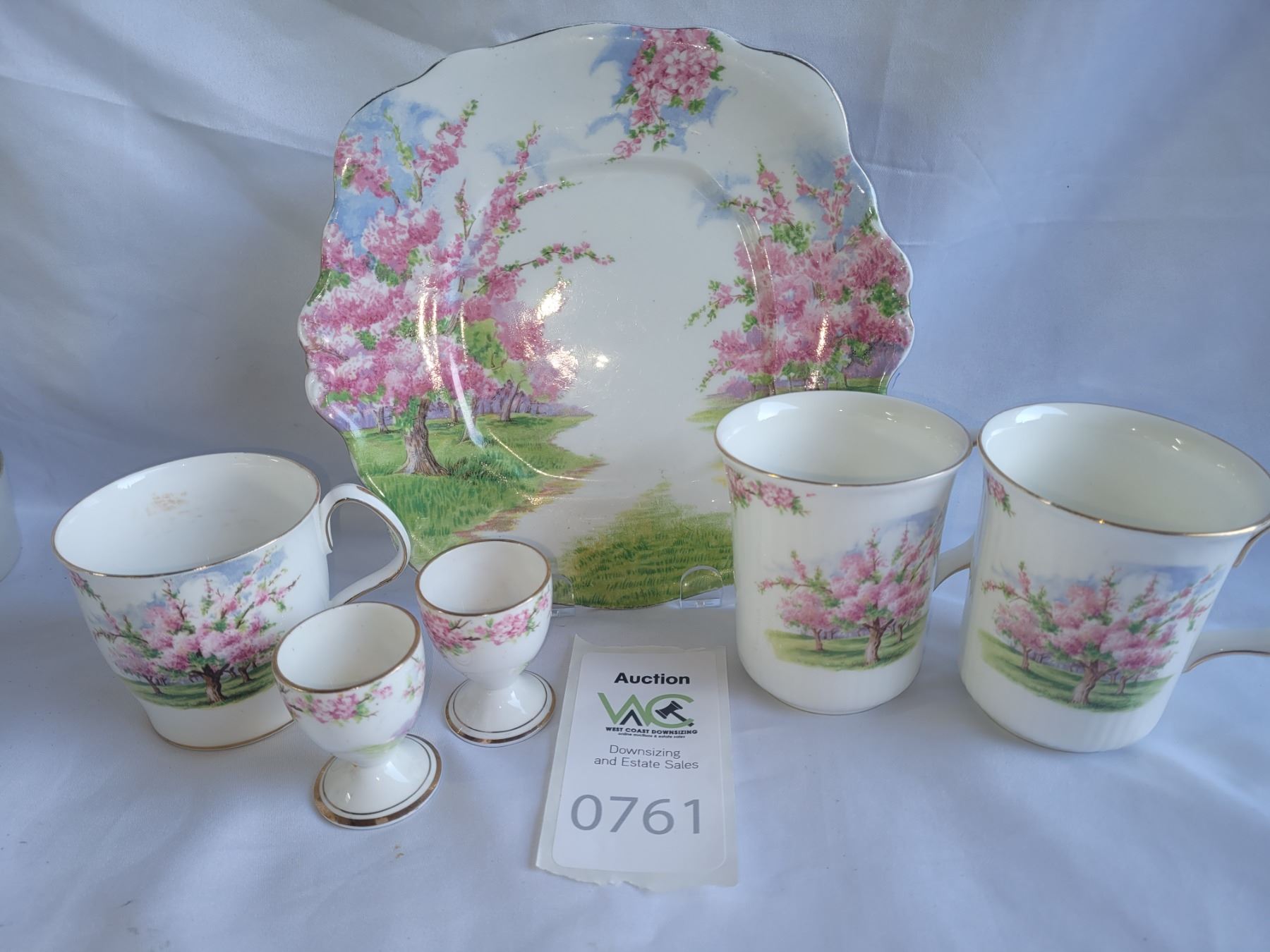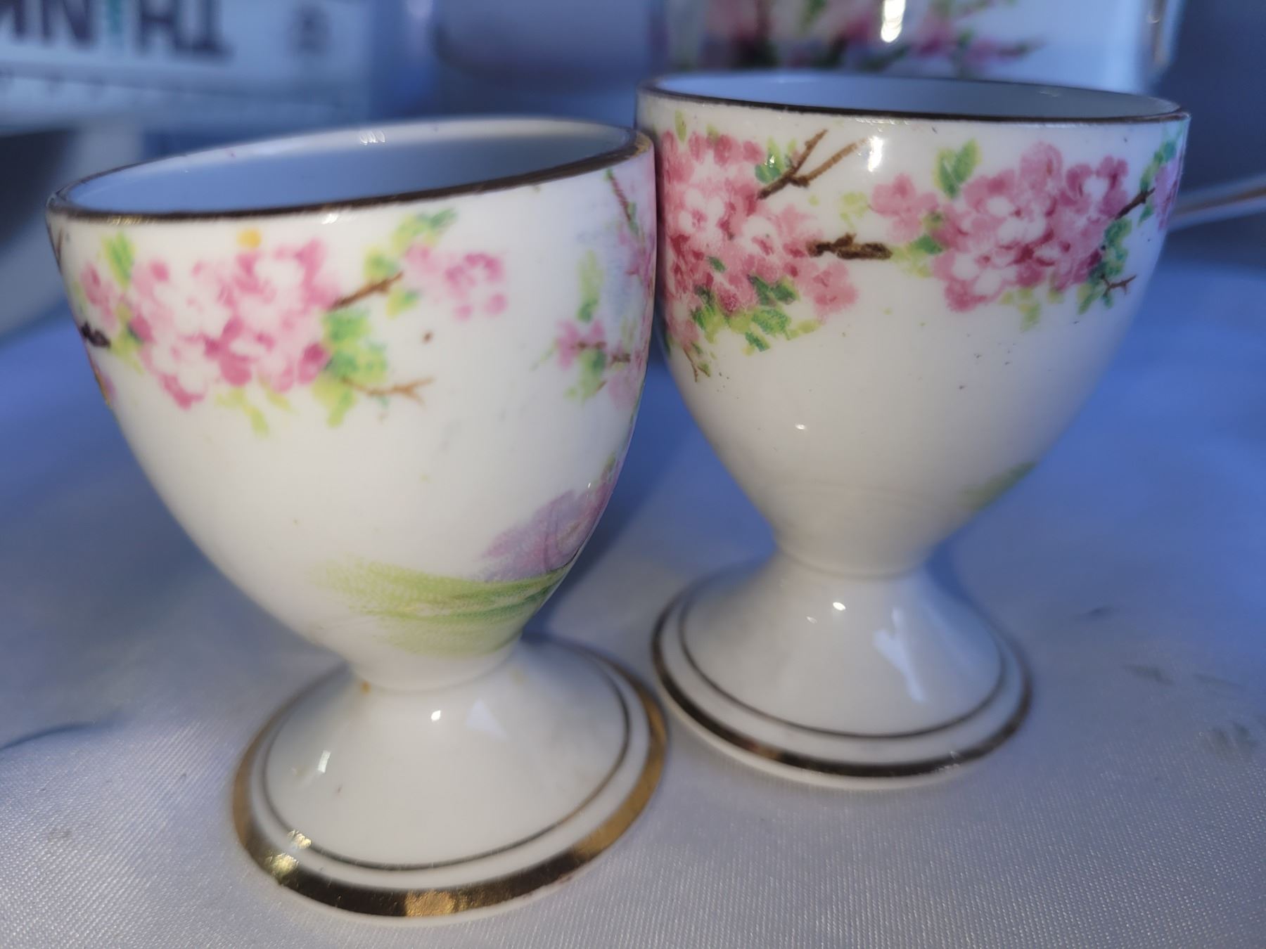 Cake plate, 2 matching coffee mugs. 1 coffee mug and two eggcups. Pickup at 9 am