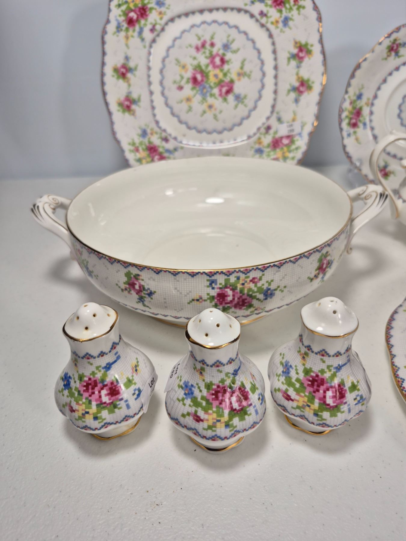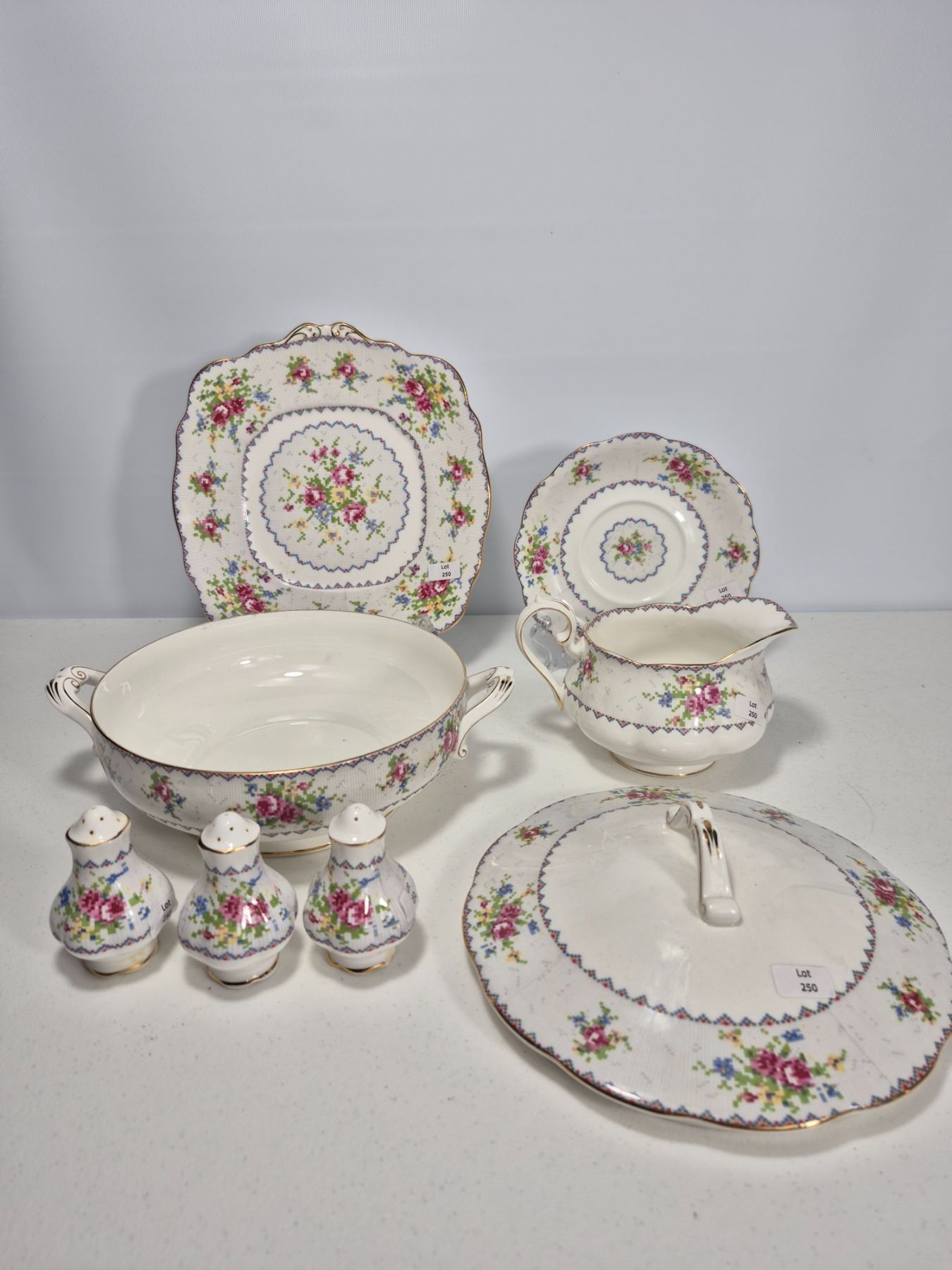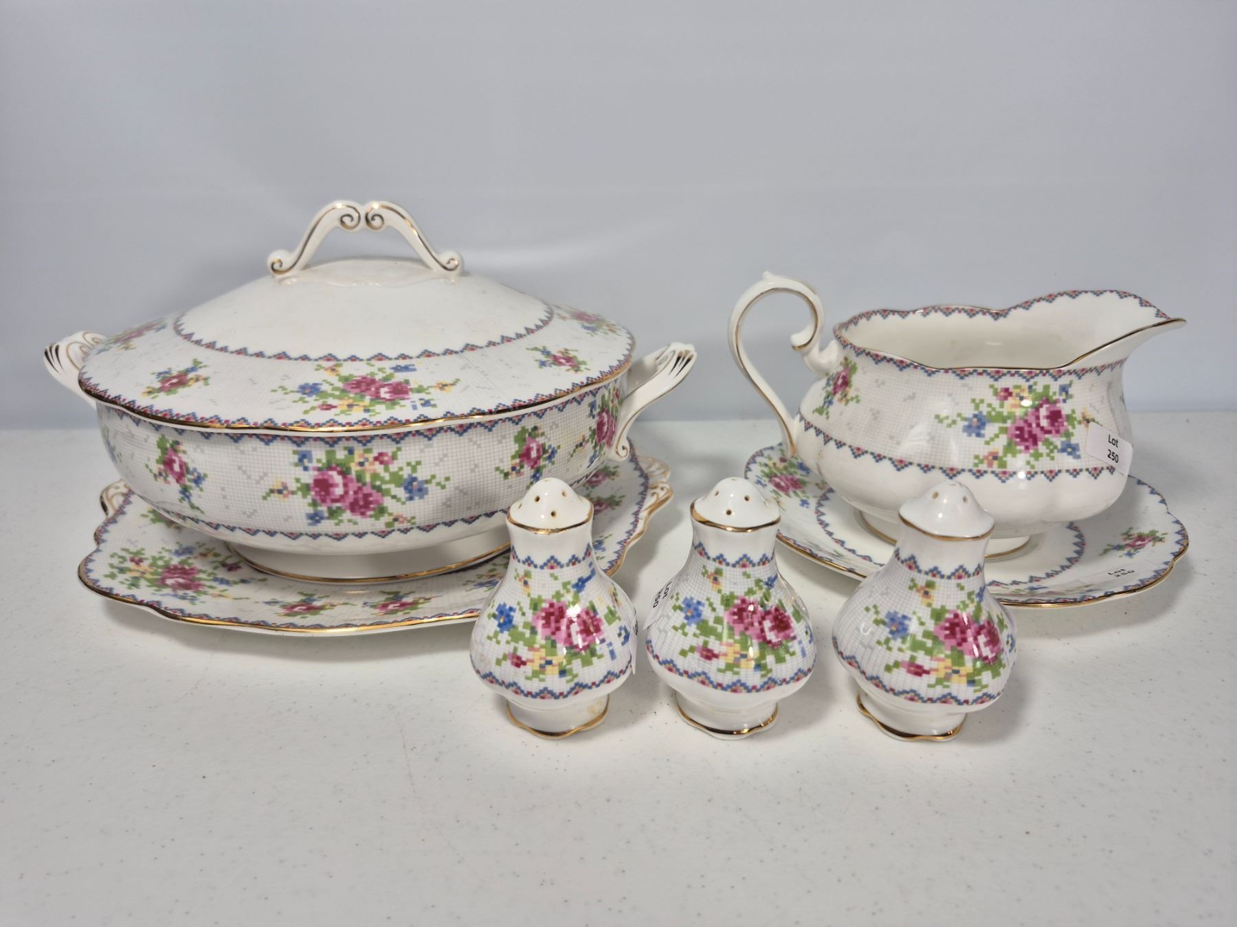 Vintage Royal Albert Bone China “Petit Point” pattern, England. Lot includes 7 pieces total: 1 covered vegetable dish, 1 cake plate, 1 gravy boat with underplate, and 1 pair plus 1 single salt & pepper shakers. Each piece decorated with the floral cross-stitch motif, scalloped edges, and gold trim. A complete and collectible Royal Albert serving group.