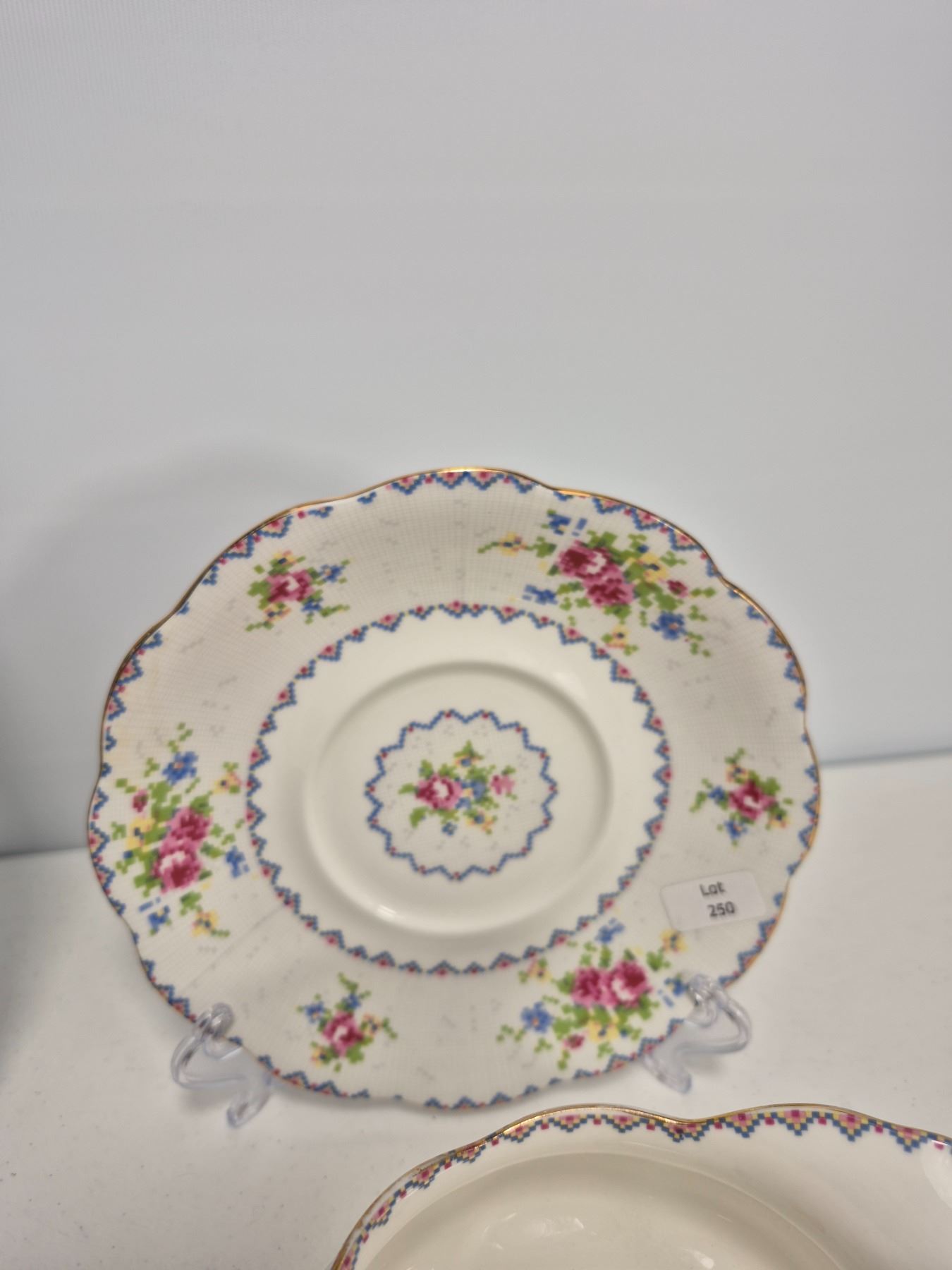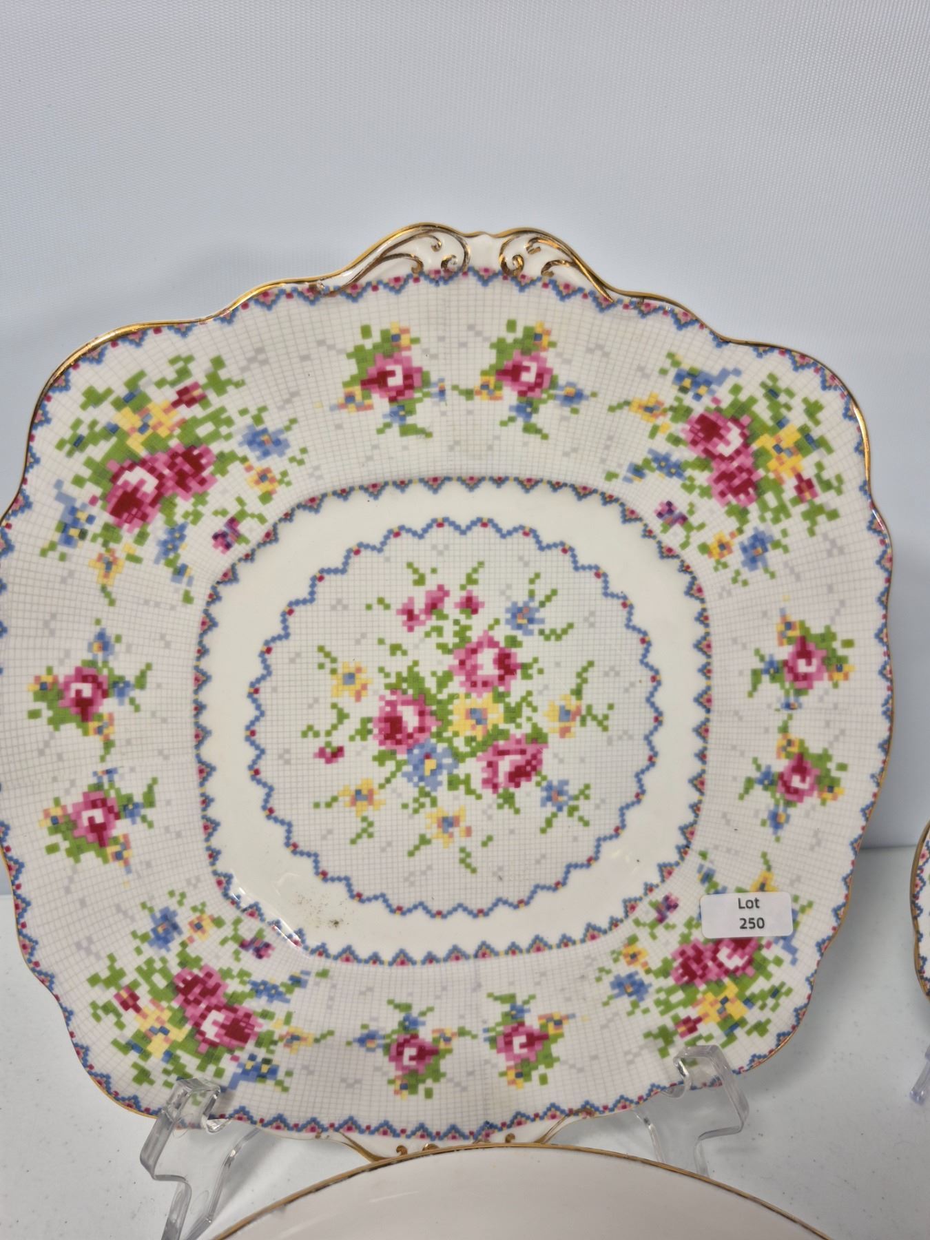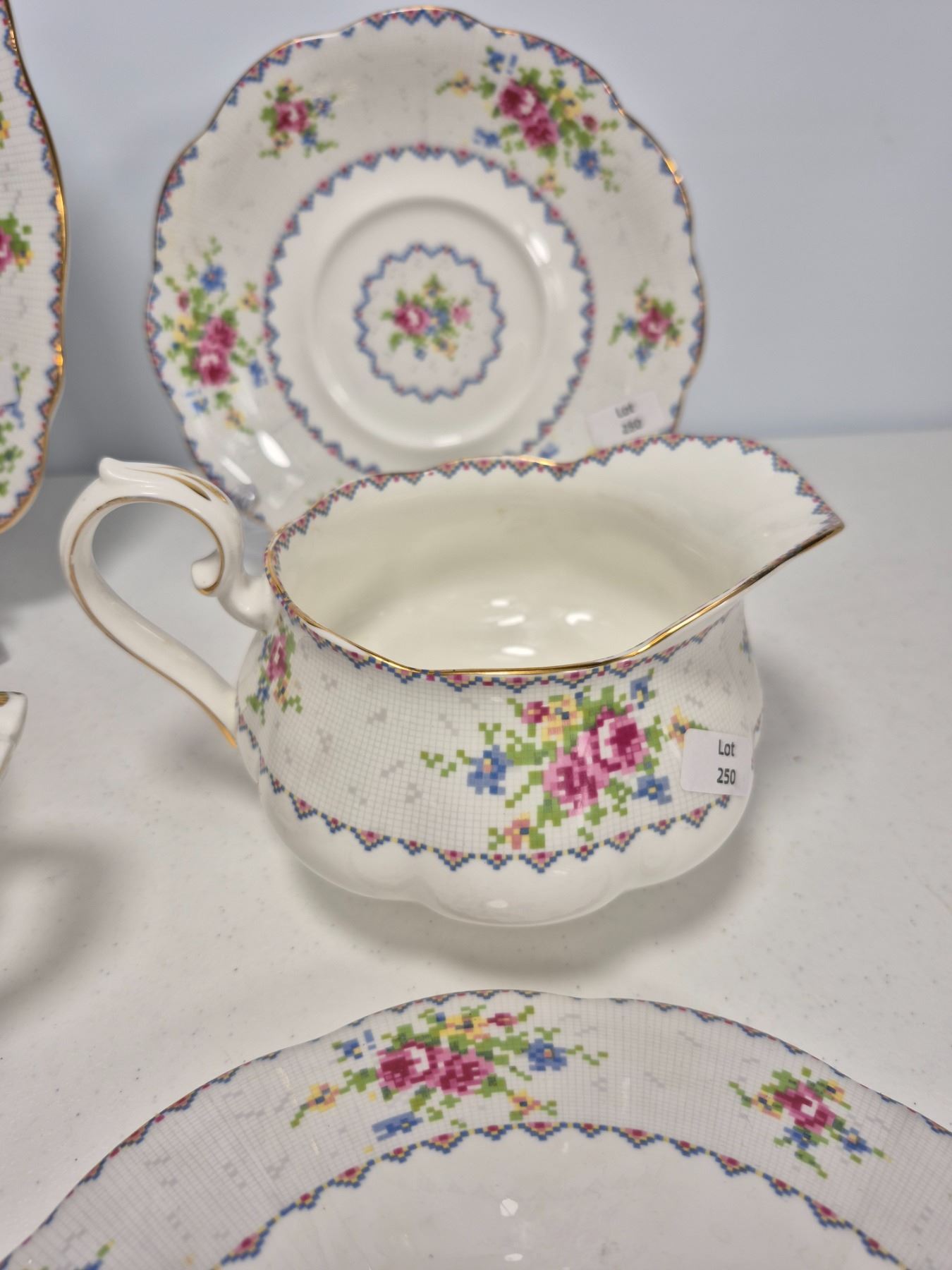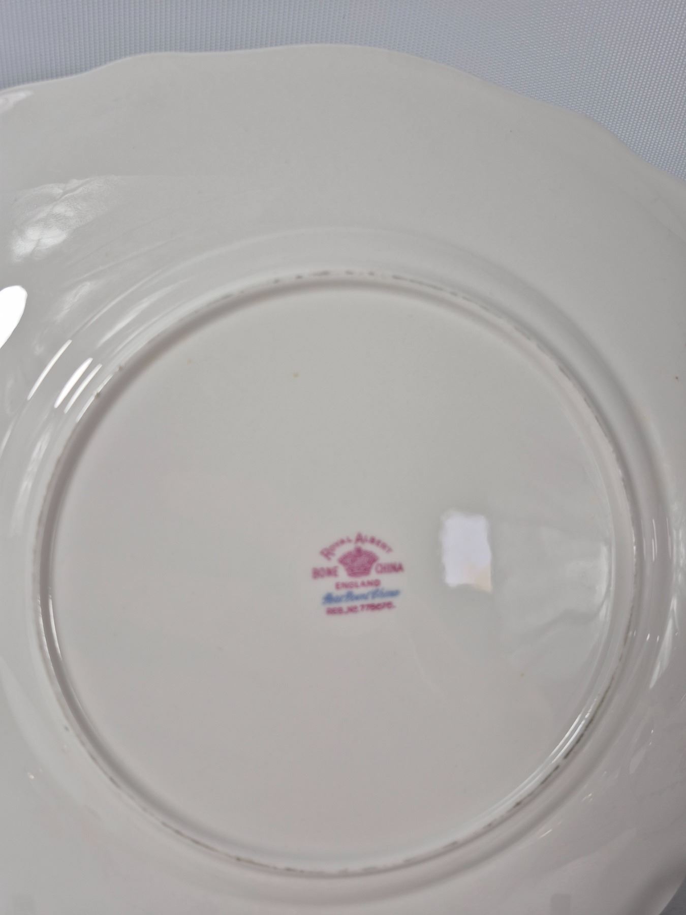 Vintage Royal Albert Bone China “Petit Point” pattern, England. Lot includes 7 pieces total: 1 covered vegetable dish, 1 cake plate, 1 gravy boat with underplate, and 1 pair plus 1 single salt & pepper shakers. Each piece decorated with the floral cross-stitch motif, scalloped edges, and gold trim. A complete and collectible Royal Albert serving group.