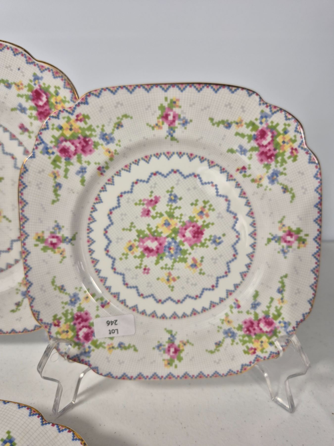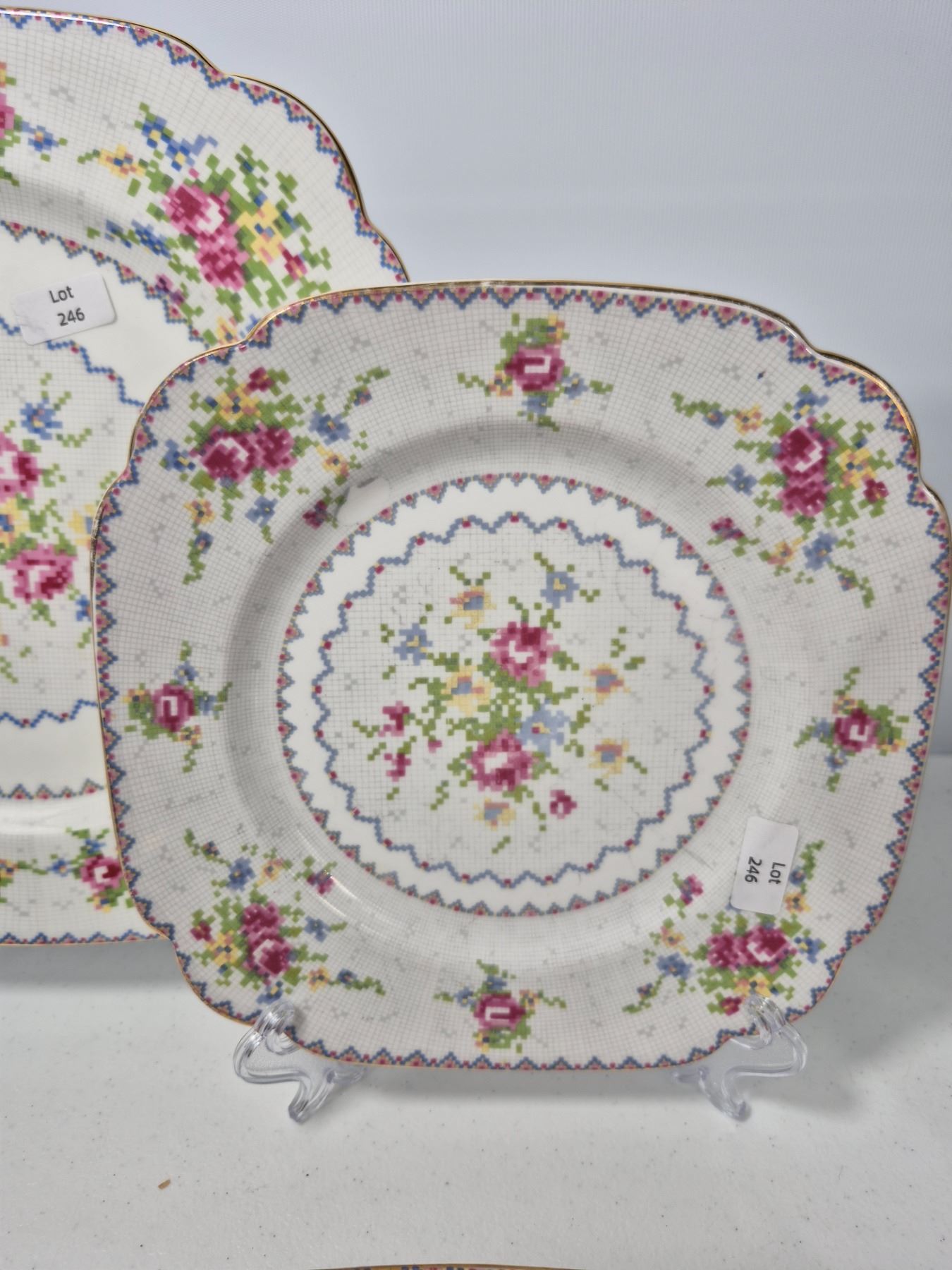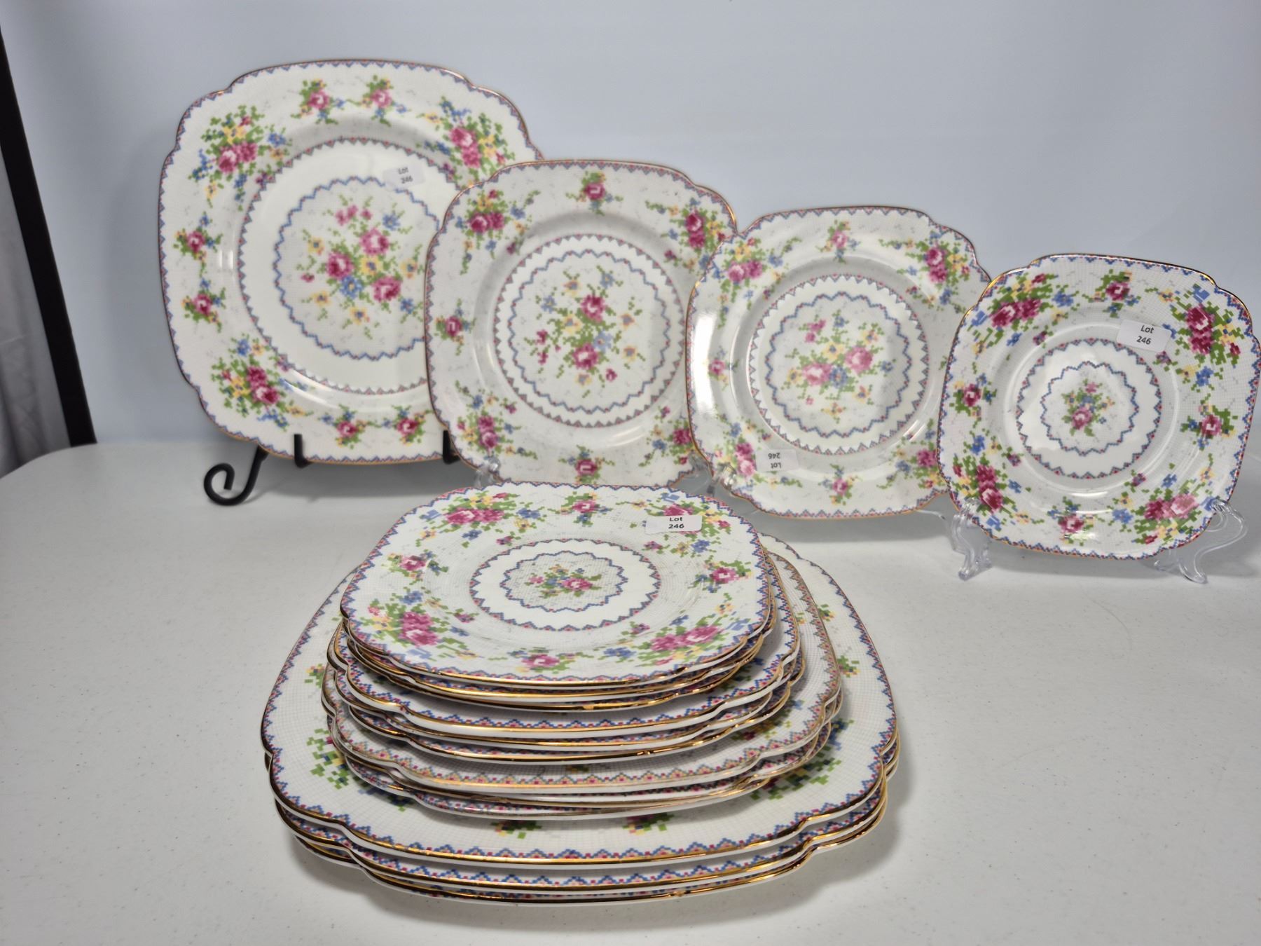 Vintage Royal Albert Bone China “Petit Point” pattern, England. Lot includes 16 pieces total: 4 dinner plates, 4 luncheon plates, 4 bread & butter plates, and 4 saucers. Each piece decorated with the signature floral cross-stitch motif, scalloped edges, and gold trim. Matches Lot 245.