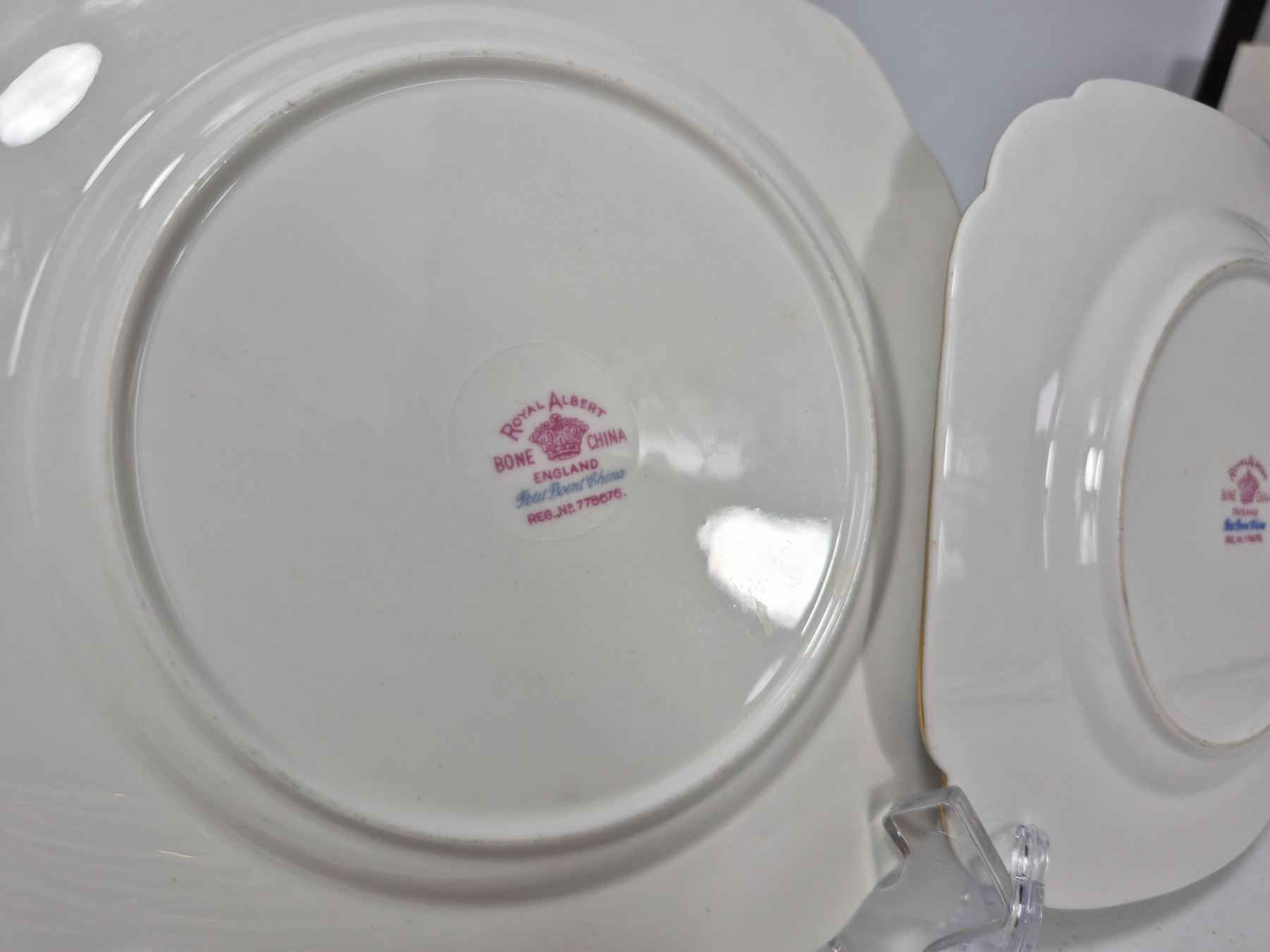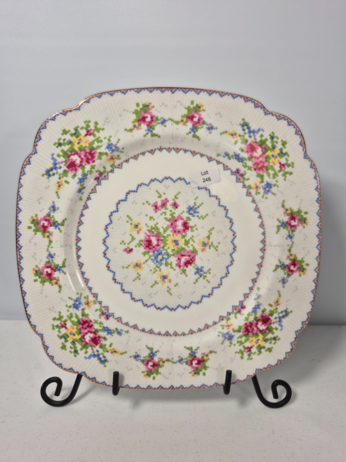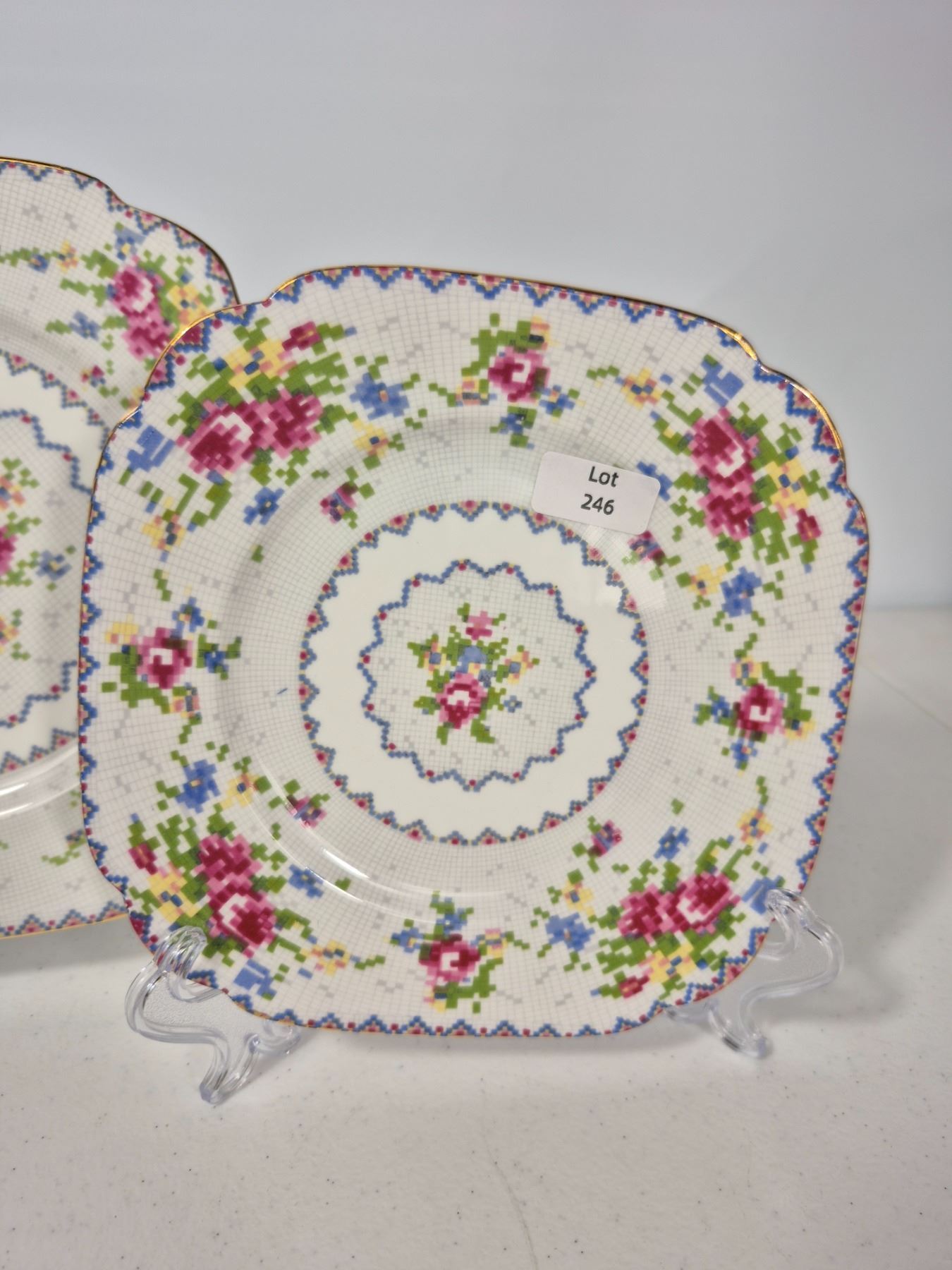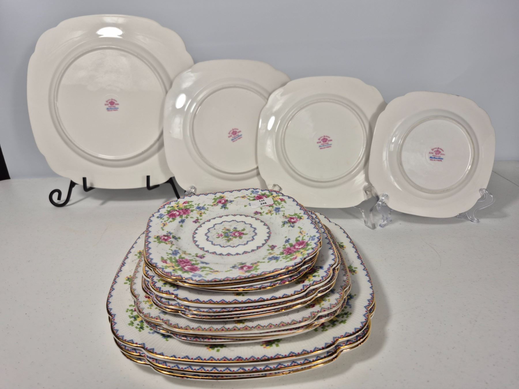 Vintage Royal Albert Bone China “Petit Point” pattern, England. Lot includes 16 pieces total: 4 dinner plates, 4 luncheon plates, 4 bread & butter plates, and 4 saucers. Each piece decorated with the signature floral cross-stitch motif, scalloped edges, and gold trim. Matches Lot 245.