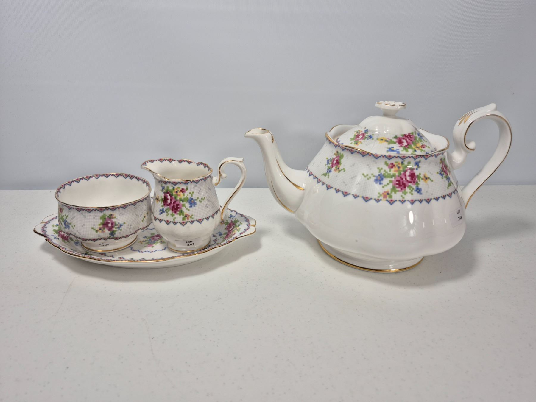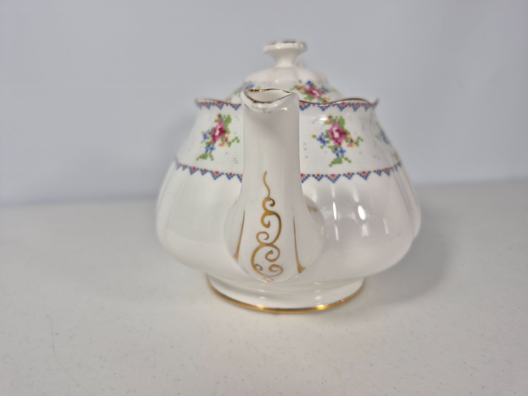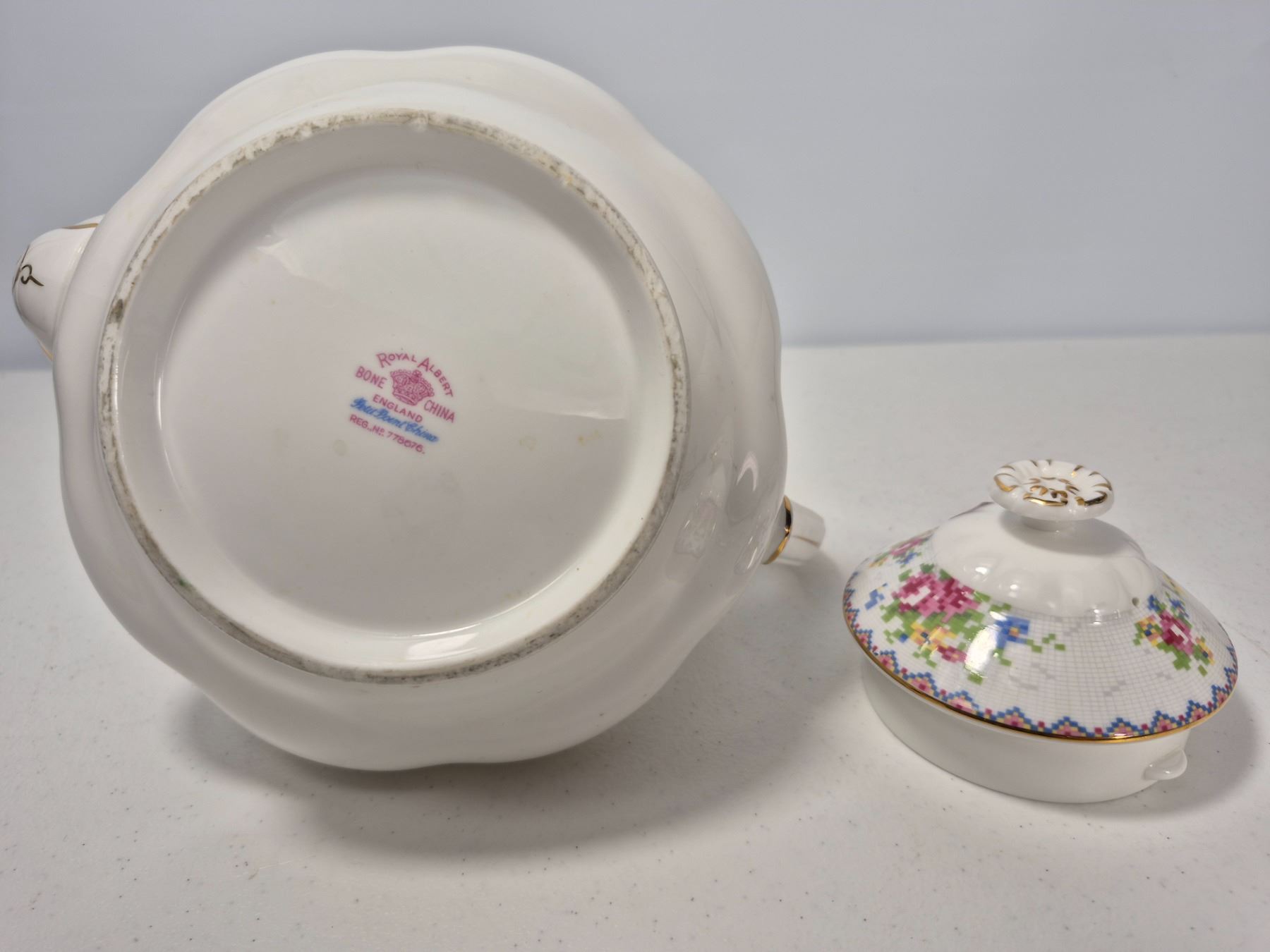 Vintage Royal Albert Bone China “Petit Point” pattern, England. Lot includes 4 pieces total: 1 teapot with lid, 1 creamer, 1 open sugar bowl, and 1 matching tray. Each piece decorated with the floral cross-stitch motif, scalloped edges, and gold trim. A beautiful and collectible Royal Albert tea service set.