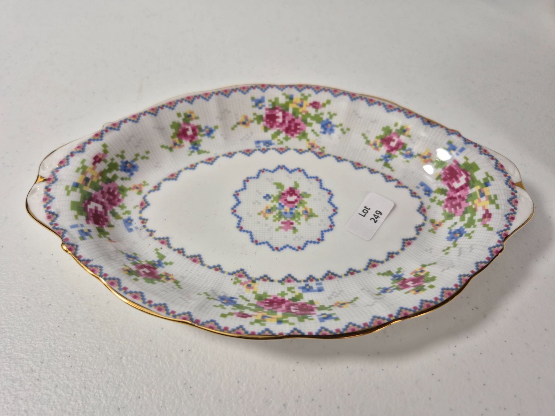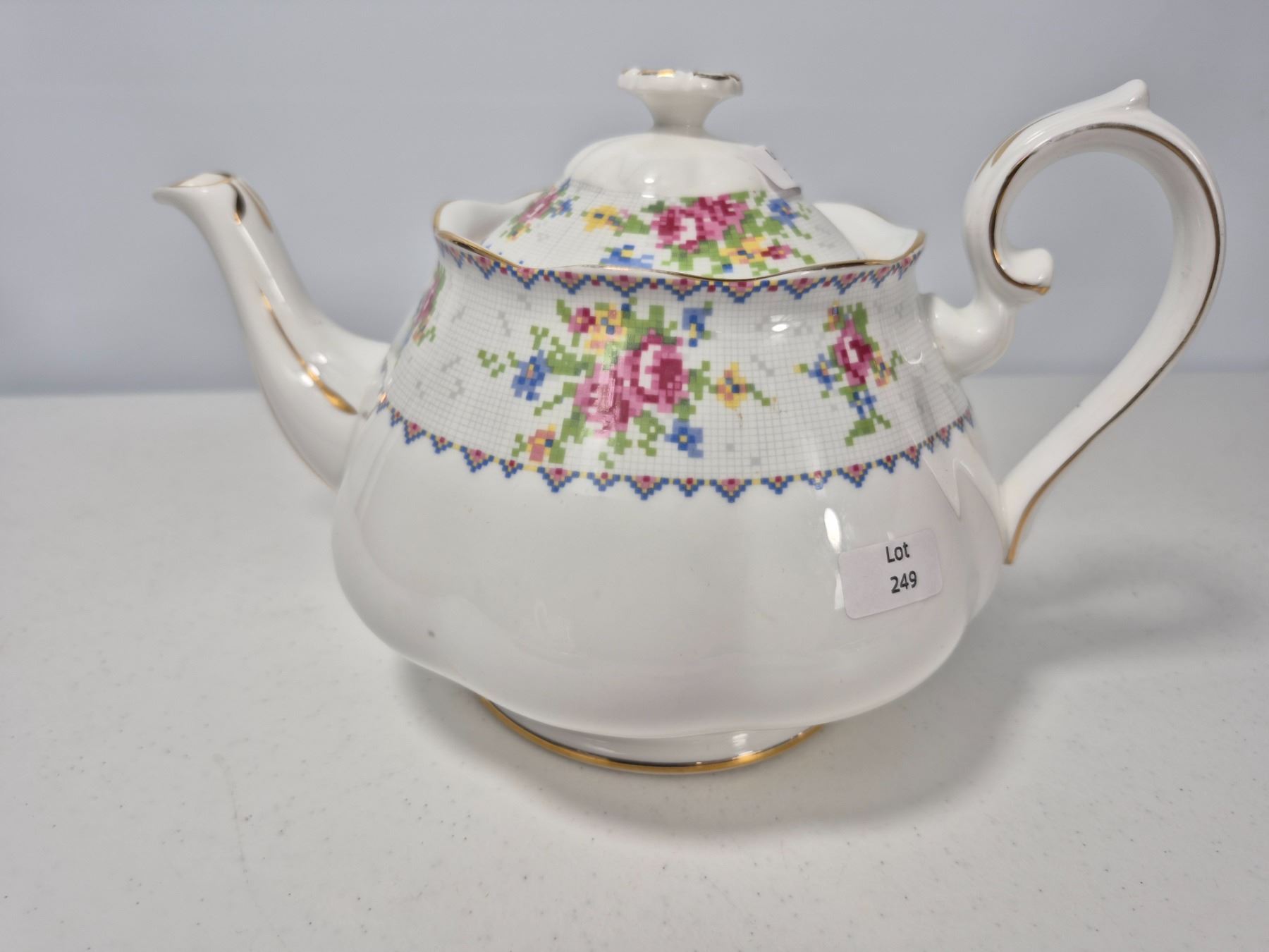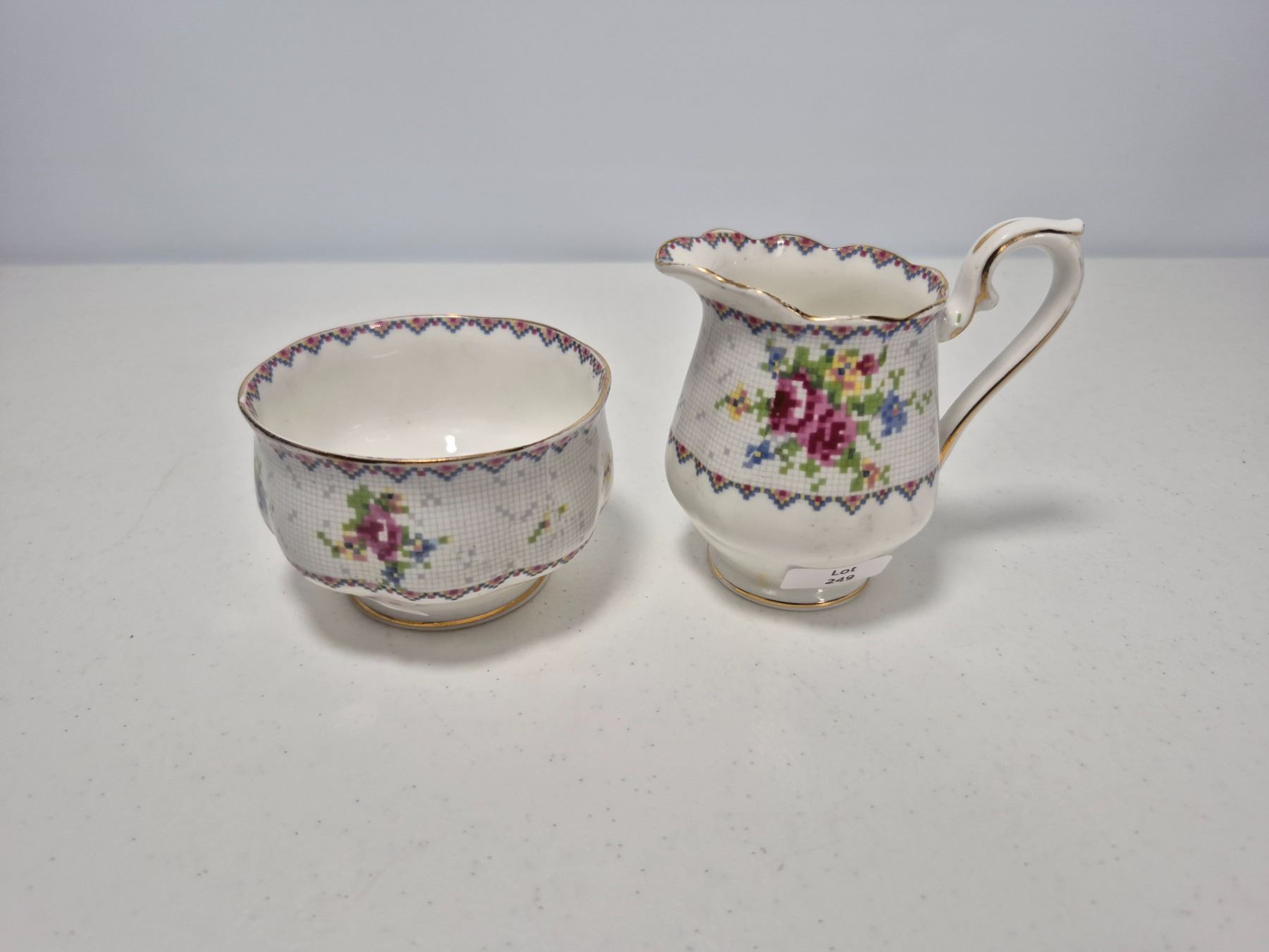 Vintage Royal Albert Bone China “Petit Point” pattern, England. Lot includes 4 pieces total: 1 teapot with lid, 1 creamer, 1 open sugar bowl, and 1 matching tray. Each piece decorated with the floral cross-stitch motif, scalloped edges, and gold trim. A beautiful and collectible Royal Albert tea service set.